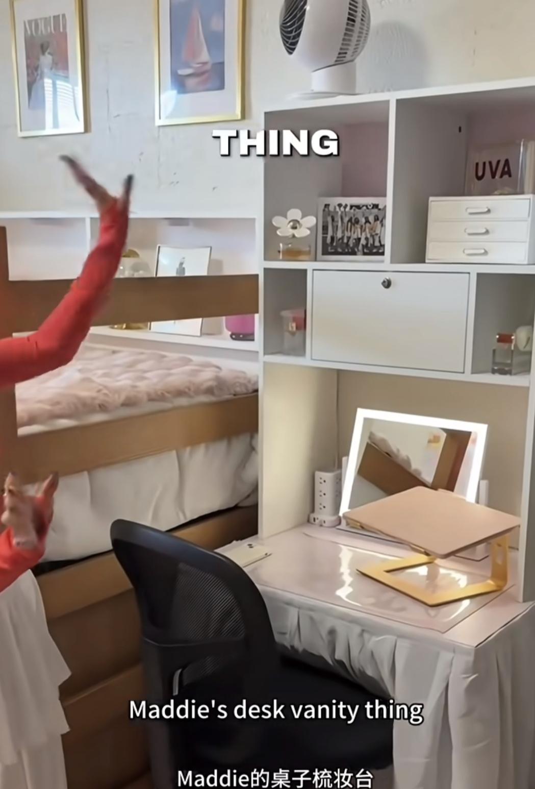 看了佛吉尼亚大学一名女生介绍自己的宿舍,颇有感触! 这是一个两人间,里面没有卫生间和阳台,一进门,右手边一堆小家电,挺实用,看来宿舍的电线扛得住。 床和上面的被子褥子很厚实,看着就很舒服,而且床是实木的,非常敦厚。 屋里的各种柜子很多,可以容纳学生很多行李和物品。 卫生间需要去走廊,还有一个类似公共小厨房的地方,可以做点简单吃喝。 整体感觉,我们大学在宿舍方面还是有很大的追赶空间。 带你看宿舍环境 海外见闻