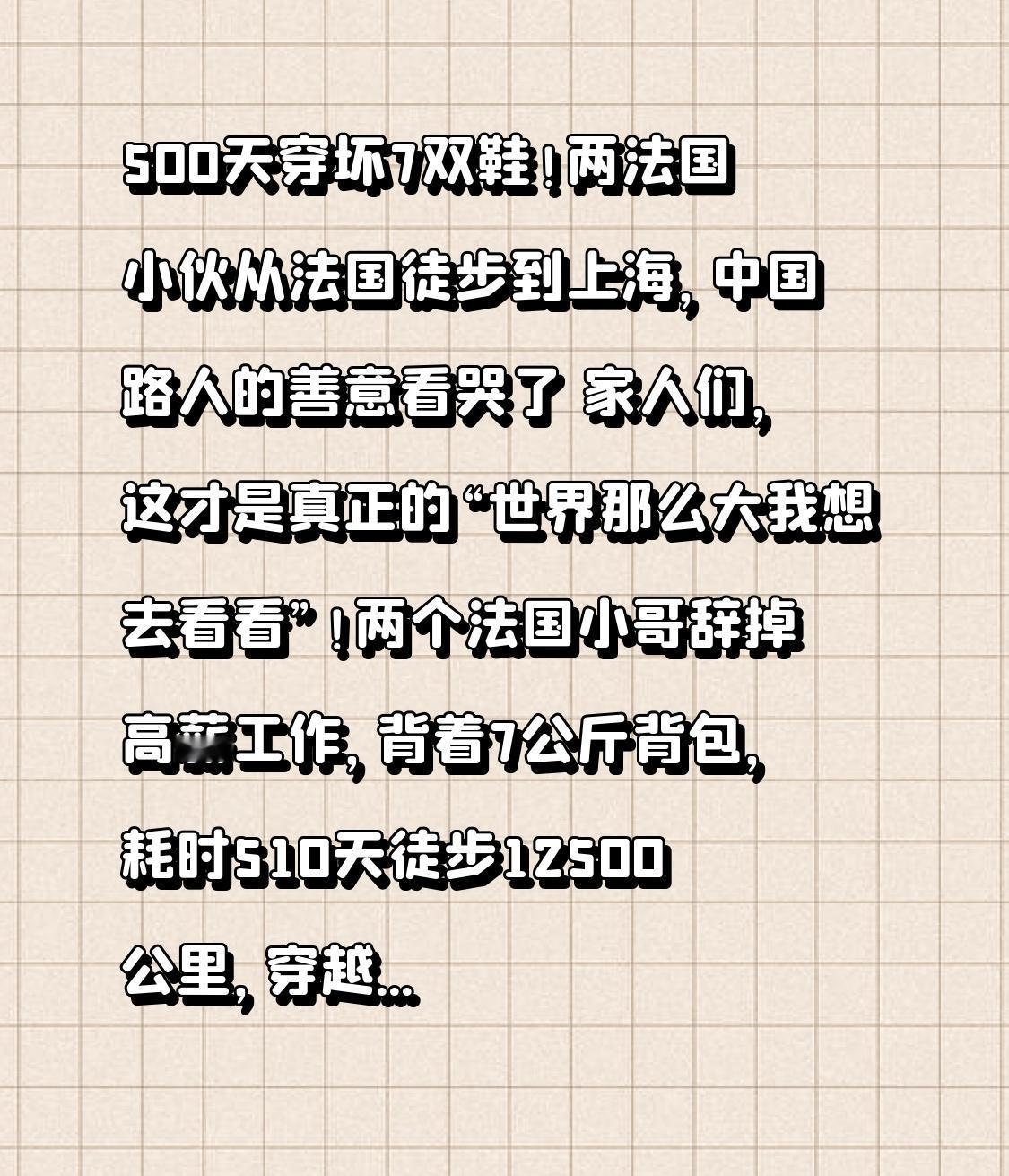 500天穿坏7双鞋!两法国小伙从法国徒步到上海,中国路人的善意看哭了 家人们,这才是真正的“世界那么大我想去看看”!两个法国小哥辞掉高薪工作,背着7公斤背包,耗时510天徒步12500公里,穿越16个国家,从法国安纳西一路走到上海,穿坏7双鞋、每天暴走一个马拉松,沿途的风景和善意,比任何旅行都动人! 27岁的本杰明是计算机科学家,26岁的洛伊克是环境顾问,两人是认识15年的发小。2023年一次聚会,他们突发奇想:“徒步去中国上海吧!” 这个看似疯狂的决定,让他们毅然辞掉稳定工作,用9个月规划路线、申请签证,2024年9月7日,在几十位亲友的送别中,他们背着帐篷、炊具和药品,踏上了这场横跨亚欧大陆的旅程。 谁能想到,这段旅程的艰难远超想象!前三个月翻越阿尔卑斯山时,每天要走30公里山路,晚上只能在野外露营;进入乌兹别克斯坦沙漠,白天烈日炙烤,地表温度超过40℃,他们只能改成夜间赶路,好几次差点断水断粮,全靠路边小车站工作人员接济;而进入中国新疆后,又遭遇零下5℃的严寒,雨雪打湿衣物,每走一步都冻得刺骨。 本以为支撑他们走下去的是毅力,没想到第一个转折点来了——沿途陌生人的善意,成了最温暖的动力!在哈萨克斯坦,车站大叔听不懂英文,却默默给他们煮热汤;进入中国霍尔果斯后,更是被一路的温暖包围:新疆加油站工作人员为他们开专属房间取暖,煮热腾腾的方便面;安徽大雪天,宾馆老板反复叮嘱“慢点走,注意安全”;沿途小朋友追着送手工礼物,老人拉着他们唠家常,连翻译软件都跟不上热情的节奏。 更让人意外的是第二个转折点:这两个法国小哥对中国的认知,也在徒步中彻底刷新!出发前,他们觉得中国是“世界尽头”,对中国文化知之甚少;可一路走来,独库公路的壮美、兵马俑的震撼、各地美食的风味,还有中国人刻在骨子里的好客,让他们彻底着迷。本杰明说:“中国比想象中更辽阔、更多元,每个省份都有不一样的惊喜,这里的人们永远带着微笑,让我们感受到家的温暖。” 510天里,他们每天坚持走45公里,相当于一个全程马拉松,每人穿坏了7双徒步鞋,脚上的水泡消了又起;他们也曾疲惫争吵,但多年的友谊让他们互相包容,休息一晚就重归于好。他们用镜头记录下沿途的一切,在小红书分享徒步日常,没想到吸引了大批中国网友关注,有人提前在他们必经之路等候,送上补给和祝福,还有上海网友自发组织,要陪他们走完最后一公里。 2月7日,当他们终于抵达上海时,两人激动得拥抱落泪。这场旅程,他们不仅跨越了地理的距离,更跨越了文化的隔阂。他们说:“没有沿途人们的帮助,我们走不到上海。这趟旅程让我们明白,世界比想象中更温暖,人与人之间的善意,能跨越语言和国界。” 现在,他们计划在上海短暂庆祝后,继续挑战徒步环游世界。这两个法国小哥用行动告诉我们:有些梦想看似遥不可及,只要勇敢迈出第一步,坚持下去,就能抵达心中的远方。而那些不期而遇的善意,更是旅途中最珍贵的收获。 你有没有过一场说走就走的旅行?如果有机会,你最想徒步去哪个地方?欢迎在评论区聊聊,也为这两个勇敢追梦的小哥点个赞,转发给身边有梦想的朋友,告诉他们:勇敢去做吧,沿途的风景和善意,不会辜负每一份坚持!
