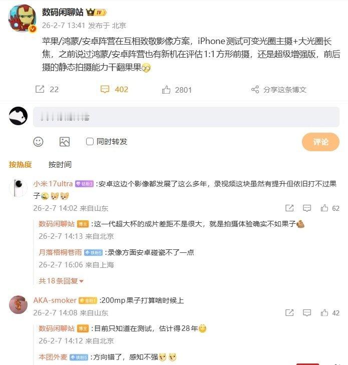 有网友感叹安卓影像都发展多年录视频虽有提升但依旧打不过苹果,博主表示:“这一代超大杯的成片差距不是很大,就是拍摄体验确实不如果子。”还有网友询问苹果何时配备 2 亿像素镜头,博主回复称:“目前只知道在测试,估计得 28 年。”