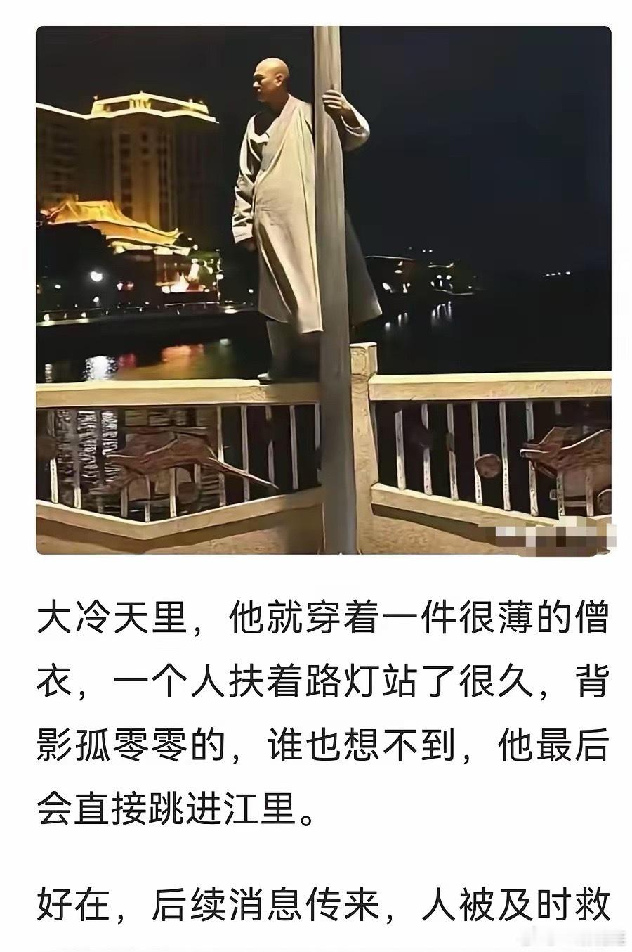 “扶灯大师”后续,跳河后,被救起,无生命大碍,现在进医院!面对佛门寺庙管理,一地鸡毛,跳河明志的现状,应该加强沟通和管理了,佛渡人,不渡己,佛门早已不是六根清净,四大皆空了!给扶灯大师找个住处吧?