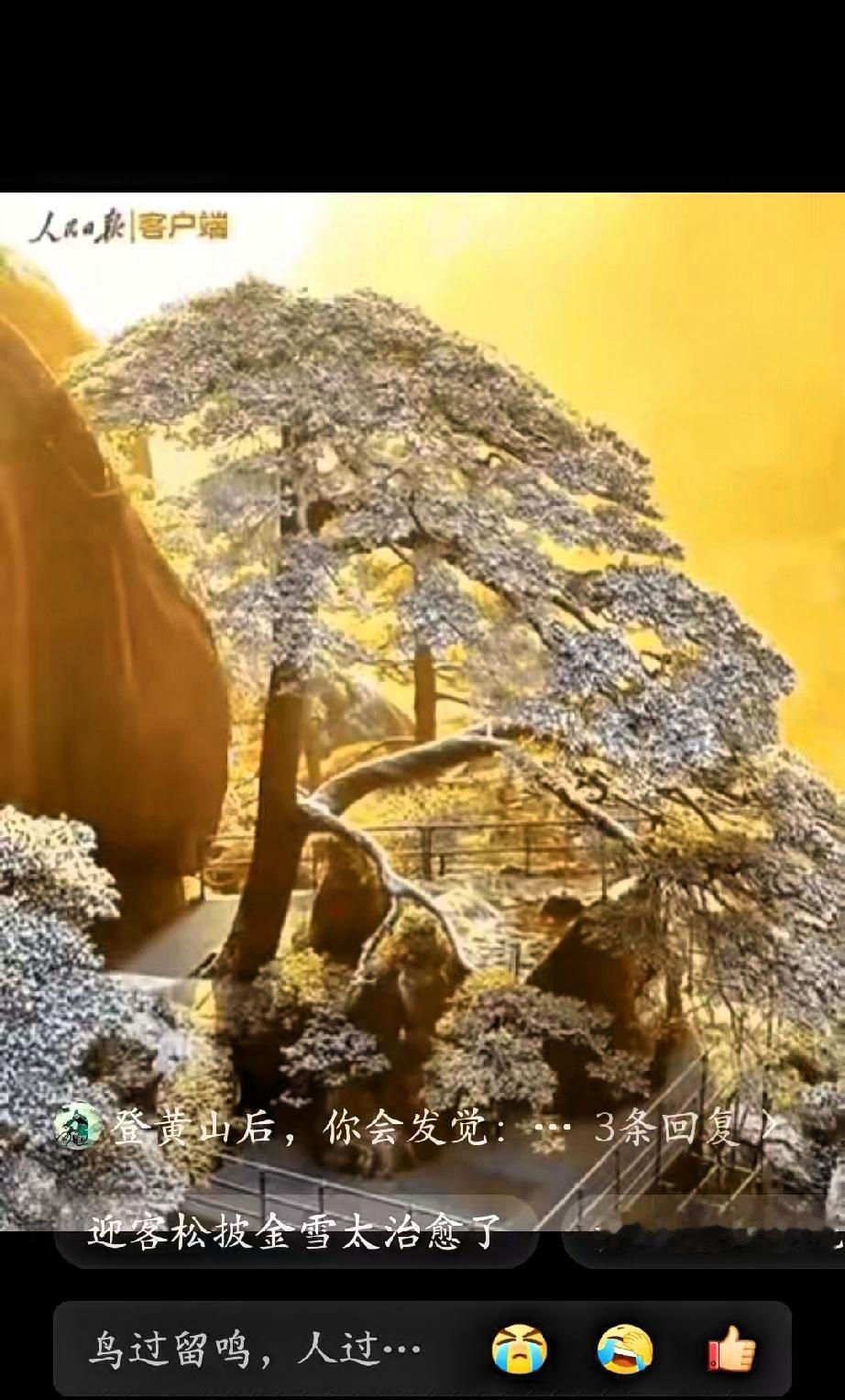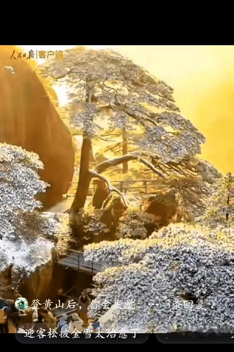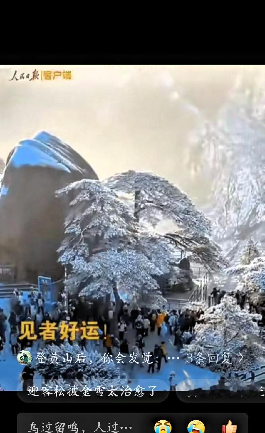 上人民日报了!男子去爬黄山,本想用无人机记录生活,却在不经意间,捕捉到雪后黄山难得的景象。 山间刚落过薄雪,树木、岩石都覆着一层素白,整体清清爽爽,没有刻意修饰,也没有华丽布景。无人机行至半山腰,云层渐渐散开,清晨的第一缕阳光穿透雾气,柔和地洒在雪后的山巅与迎客松上。 白雪与微光相映,画面安静又治愈,没有惊心动魄的震撼,却有着自然本真的美感。很多人多次登临黄山,见过不同时节的景色,却很少遇上这样恰好的光影与雪景同框。美好往往如此,越是刻意追寻,越难遇见,越是平常心对待,越容易与惊喜不期而遇。 这段平实的记录,之所以能被主流媒体关注,正是因为它真实、朴素,不炫技、不炒作,只呈现自然原本的样子,也映照出普通人记录生活的温暖。评论区里,大家纷纷留言接好运,更多是对这份宁静美好的认同,对生活里小确幸的期待。 生活中,我们总习惯追求极致与完美,却常常忽略,最珍贵的往往是那些不经意的瞬间。一次普通出行、一段随手记录、一束恰好出现的阳光,都能成为治愈人心的小美好。自然从不会刻意讨好谁,却总在恰当的时候,给用心生活的人一份温柔回馈。 愿我们都能保持平和的心态,放慢脚步,用心感受日常,在平凡生活里遇见更多真实、温暖的小美好,也把这份来自黄山的平和与顺遂,留在新一年的时光里。