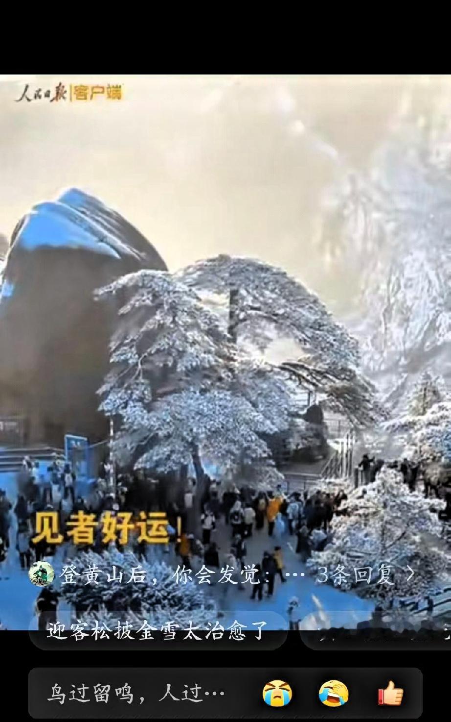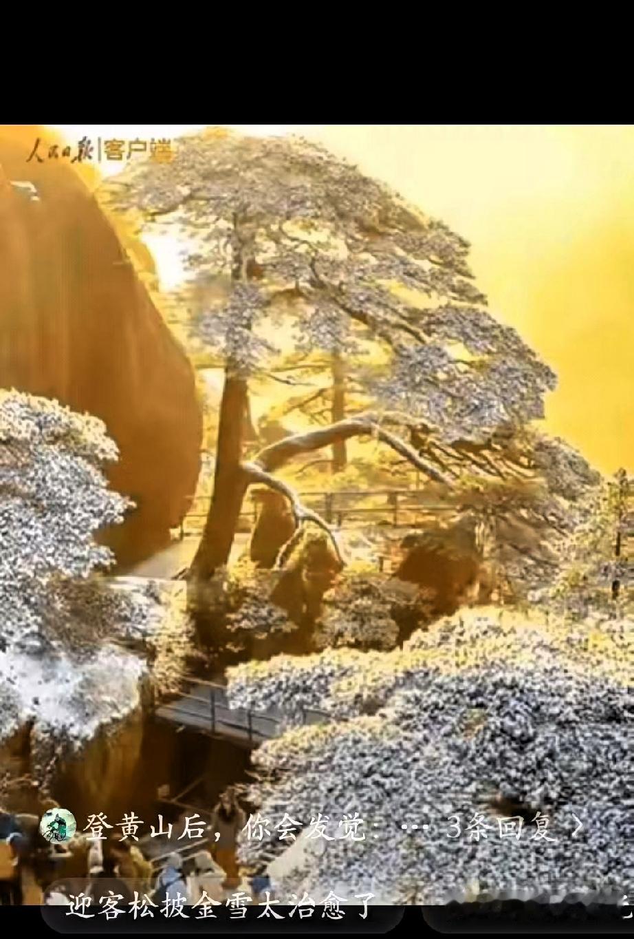 上人民日报了!男子去爬黄山,本想用无人机记录生活, 却意外捕捉到了雪后初晴、金光洒松的瞬间,这份纯粹的美好,让无数人为之动容。 视频中的画面,美得恰到好处。雪后的黄山覆盖着一层薄雪,岩石与松枝在白雪映衬下格外清新。无人机升至半山腰时,云层恰好散开,第一缕阳光穿透云层,落在迎客松上。白雪反射着阳光,与青松、山石相映,形成了一幅自然和谐的画面,没有刻意修饰,却自带宁静的力量。 这份美景的珍贵,在于它的不可复制。不少网友留言说,爬过多次黄山,从未见过这样的场景。的确,自然景观的魅力,往往就藏在这些偶然的瞬间里——雪量、云层、阳光角度,任何一个条件变化,都无法复刻相同的画面。这也正是大自然的神奇之处,它从不会按部就班,总会在不经意间给人惊喜。 更让人感慨的是,拍摄者最初并无刻意追寻美景的想法,只是出于对生活的记录。这份“无心插柳”,恰恰印证了一个道理:生活中的美好,往往不是刻意求来的,而是在用心感受中遇见的。我们总忙着规划行程、追求目标,却常常忽略了身边的点滴美好,而这位网友的经历,恰好提醒了我们慢下来的重要性。 王安石曾说“世之奇伟、瑰怪,非常之观,常在于险远”,但黄山的这一幕告诉我们,美好也藏在“不经意”间。无论是旅途还是日常,多一份从容,多一份对生活的感知,或许就能邂逅属于自己的“小美好”