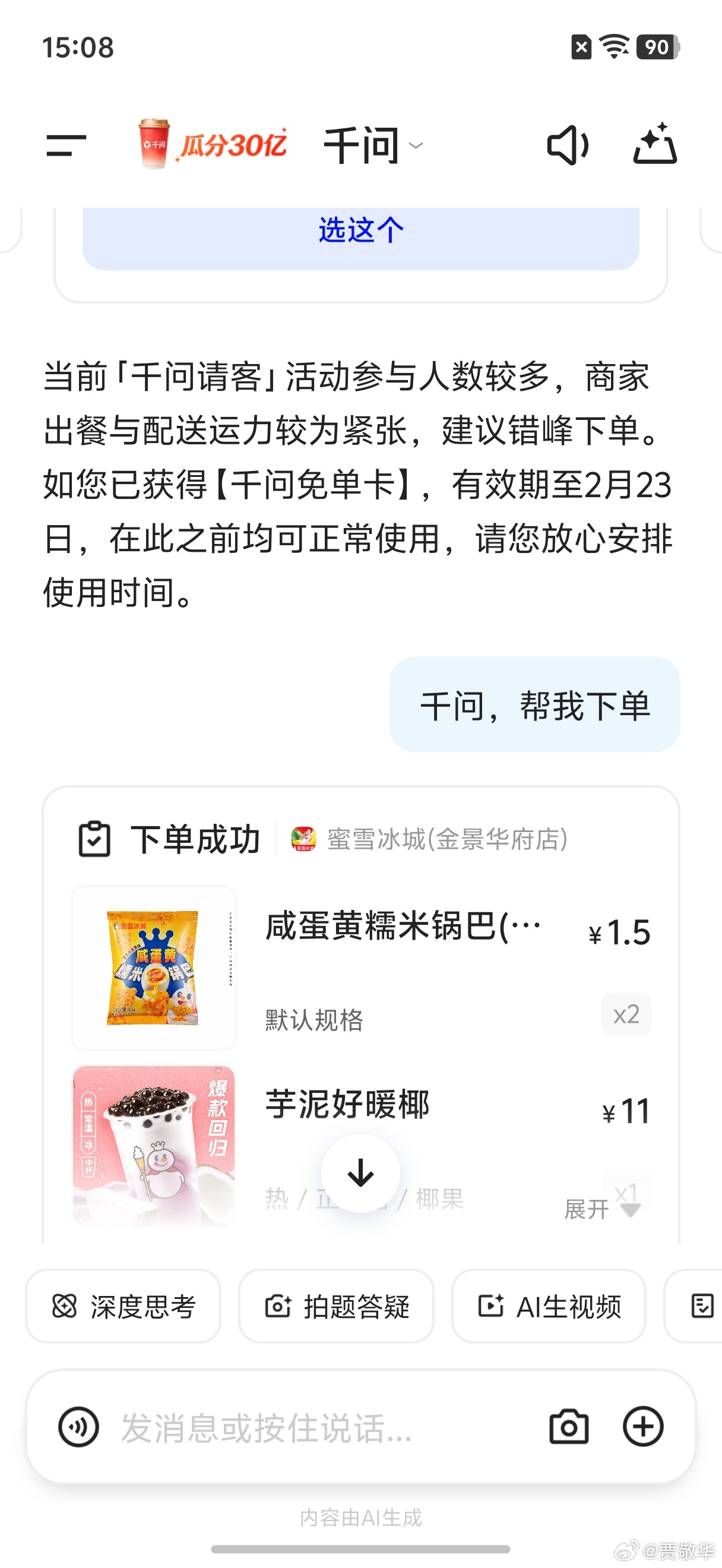 #何同学谢谢AI请客# 前几年春节互联网厂商搞红包大战,今年更有意思,直接让AI请客了。比如,阿里千问推出了请喝奶茶的活动,真的非常火啊。