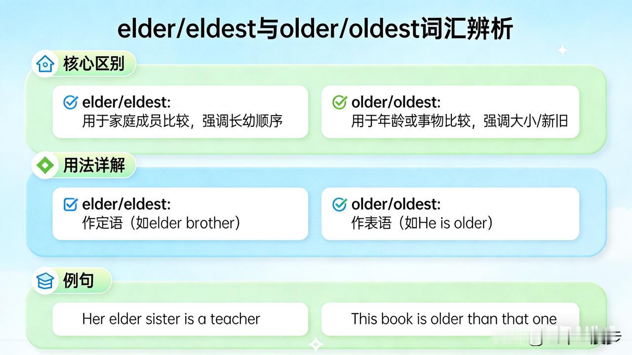 词汇辨析:elder/eldest vs older/oldest ✨ 核心区别 • elder / eldest:专门用于家庭成员(如 brother, sister, son, daughter, grandson, granddaughter),表示“年长的/最年长的”。 • older / oldest:可用于所有人或事物,是更通用的比较级和最高级。 用法详解 1. elder / eldest(家庭成员专用) • elder:用于两者之间,指“(两者中)较年长的”。 ◦ My elder brother was in a car accident last week. 我哥哥上周出了车祸。(说明只有一个哥哥) ◦ She's the elder of the two. 她是两个人中年纪大的一个。 • eldest:用于三者及以上,指“(三者及以上中)最年长的”。 ◦ The eldest daughter does all the housework. 最大的女儿干所有的家务活儿。(说明至少有两个女儿) ◦ The eldest is six years old. 年纪最大的一个今年六岁。 💡 注意:elder 和 eldest 也可用作代词,直接指代人。 2. older / oldest(通用) • 可用于任何人或事物,不受家庭成员限制。 • 例:He is older than me.(他比我年长。) • 例:This is the oldest building in the city.(这是城里最古老的建筑。) 补充说明 • 现代英语中,也有人使用 older brother, oldest son 等说法,elder / eldest 有逐渐从非正式英语中淡出的趋势。 • 总结: ◦ 家庭成员间的“长幼”:优先用 elder / eldest(尤其在正式或传统语境中)。 ◦ 其他所有比较场景:用 older / oldest。