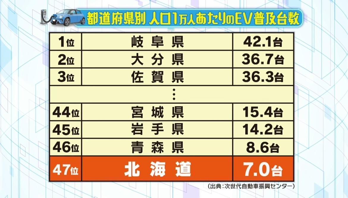 知道日本电动车普及率低,但没想到这么低。 这张图是日本都道府县人均电动车普及情况,每一万人里有多少人拥有电动车。 北海道,人均只有7台,是全国最低……看起来地广人稀、冬天又冷,大家开电动车的兴趣确实没那么高呀