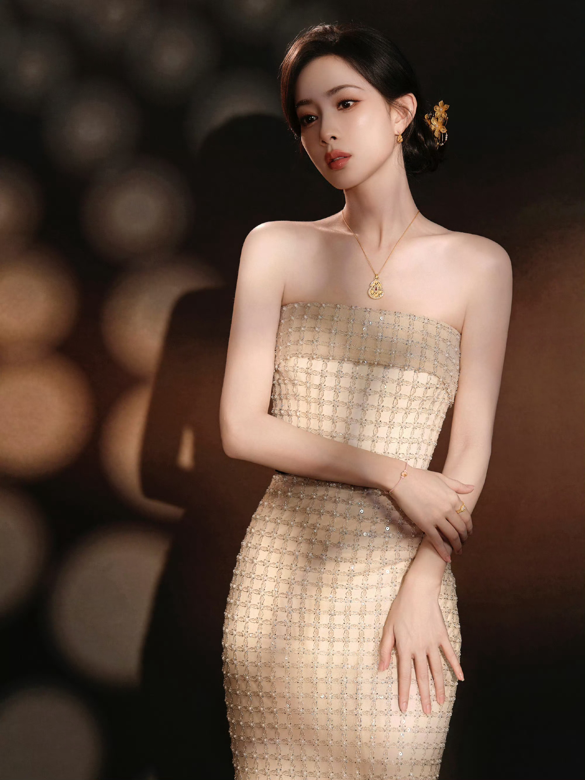孟子义珍珠抹胸裙孟子义李昀锐生图状态一袭白色珍珠抹胸裙,搭配超大黄金项链,孟