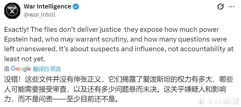 目前我们所看到的只是大量的喧嚣与纷扰,这些都几乎没有任何实质性的意义,只是表明爱泼斯坦是个变态,而那些有钱有势的人出于各种原因愿意对此睁一只眼闭一只眼。