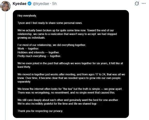 TenZ 的女友kyedae通过社交平台发布声明,确认双方已在一段时间前结束恋爱关系,并非近期突发。她表示,分开的原因并非外界猜测的矛盾或责任问题,而是在长期相处中逐渐意识到,彼此已不再以相同的方式成长。