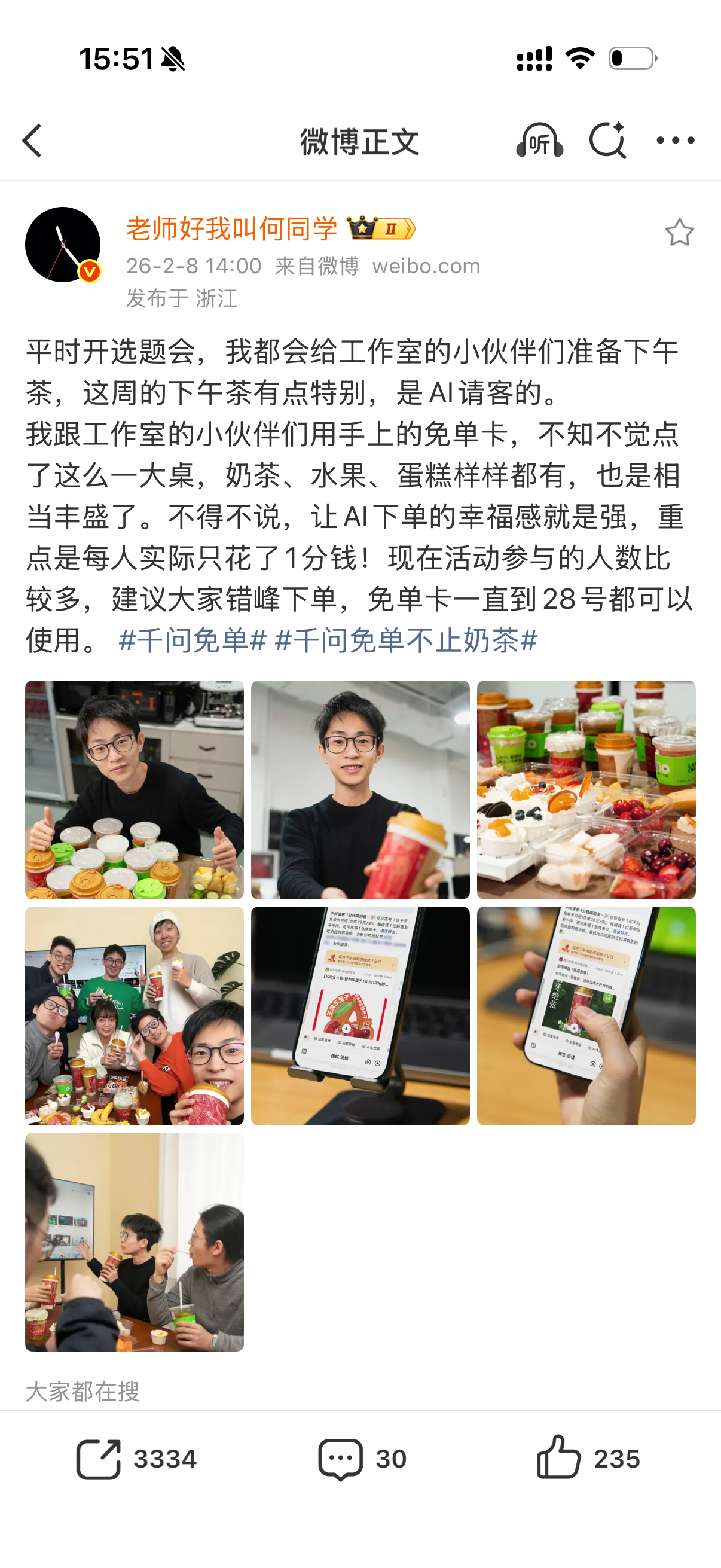 何同学谢谢AI请客好家伙,何同学也是吃上了AI请的下午茶了,千问这波营销还是太牛了。。