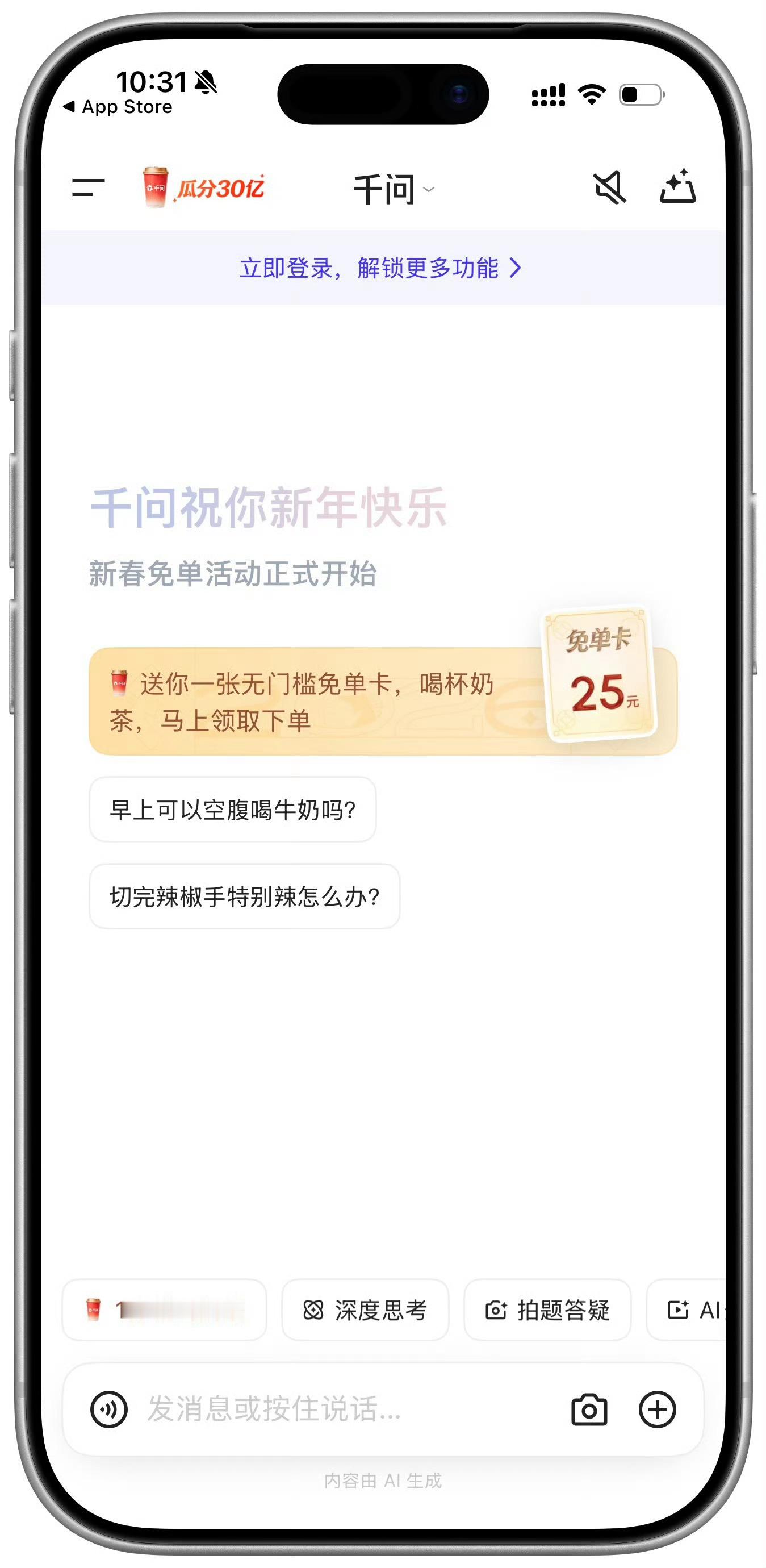 最近几天最火的就是千问薅羊毛免费奶茶了,现在不止能点奶茶、咖啡,还能点盒马生鲜跟外卖了。