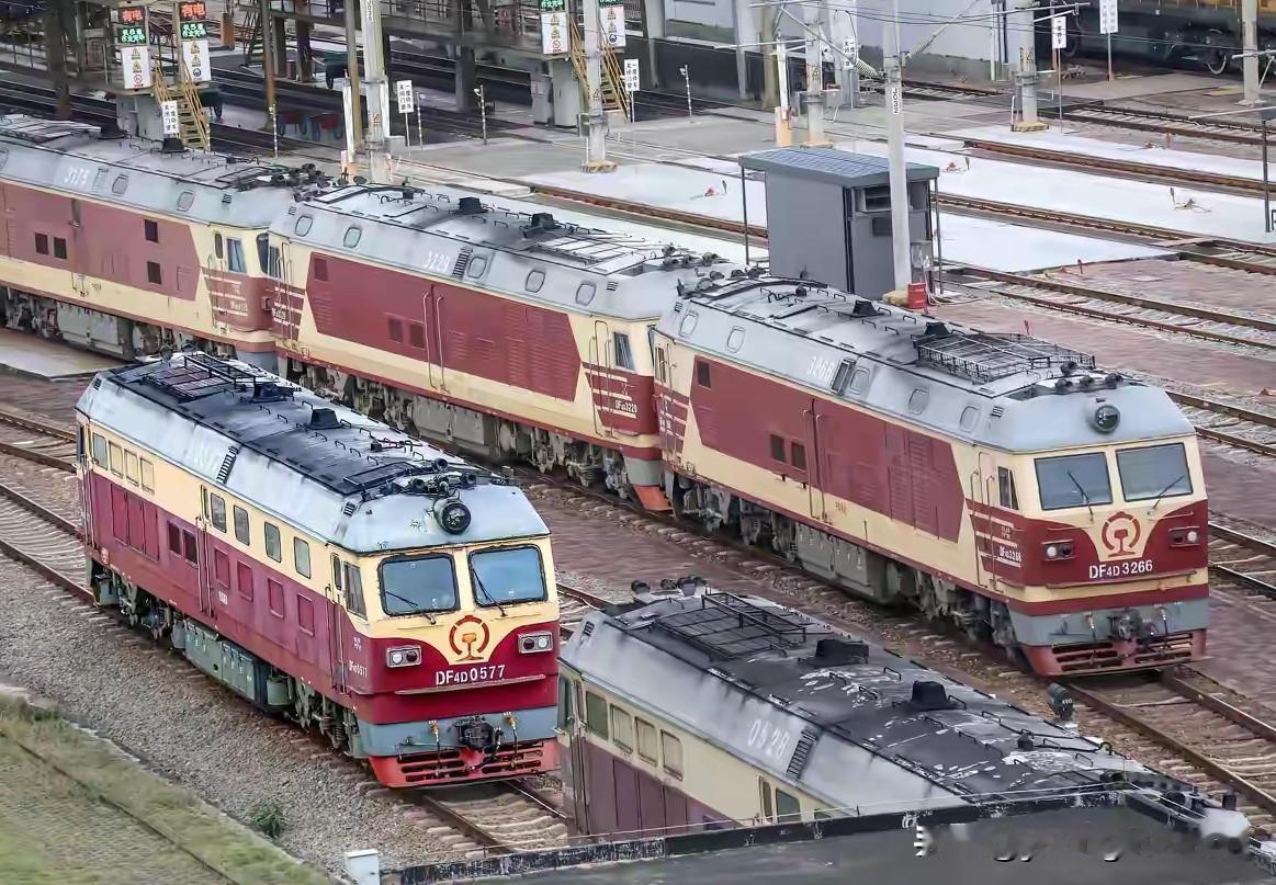 曾经铁路客运的主力内燃机车——东风4D型客运机车。图中的东风4D型内燃机车有着两种稍微不同的涂装,一种车身带有条纹的是更改了齿轮传动比的,最高时速可达170公里每小时的准高速机车,火车迷们亲切的称呼它为“花老虎”。另一种上白下红的则是普通涂装的4 D型内燃机车,最高时速145公里每小时,车迷称之为“老虎”。不过受制于当时的线路影响,当年很少有客运列车能够突破120公里以上的运行速度,因此不管是“花老虎”还是“老虎”,他们都被用于牵引T、K等各等级普速列车。后期出现Z字头直特后,也有更为先进的其他机车牵引了。