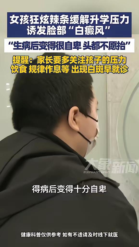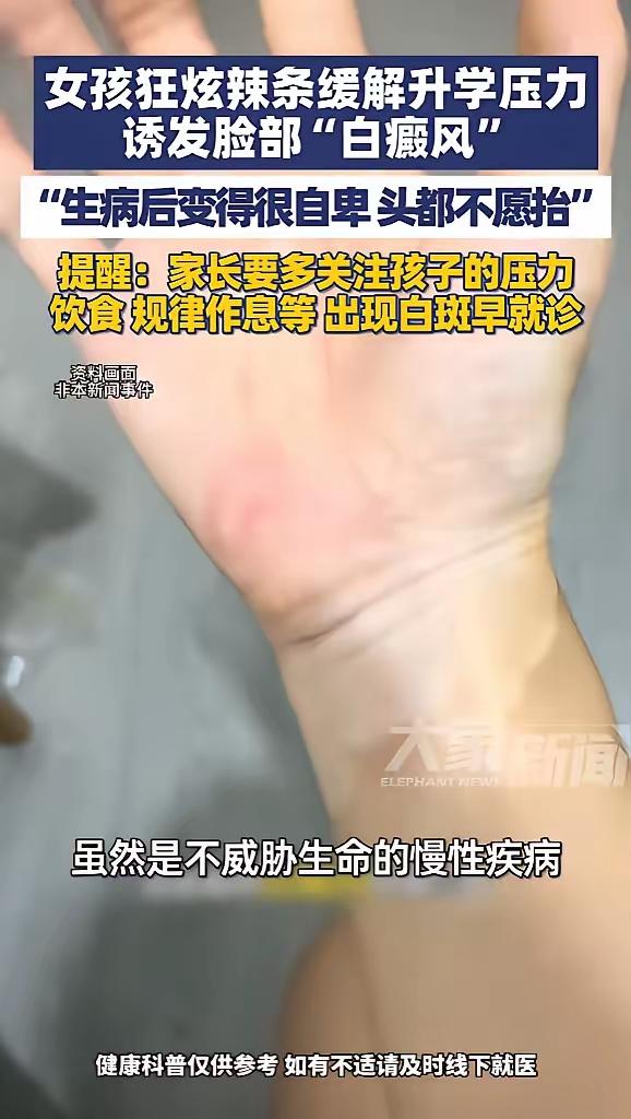 河南郑州一个初三女孩学习压力大,为了缓解压力和焦虑不安她开吃辣条,由一天一包到几包,经过一段时间后女孩突然发现脸上和手掌上出现了白斑,白斑越长越大,到医院检查结果是得了白殿风,医生讲压力大加上辣条刺激容易得白殿风,现在的女孩很自卑,不敢抬头伸手,连门都不愿意出了。