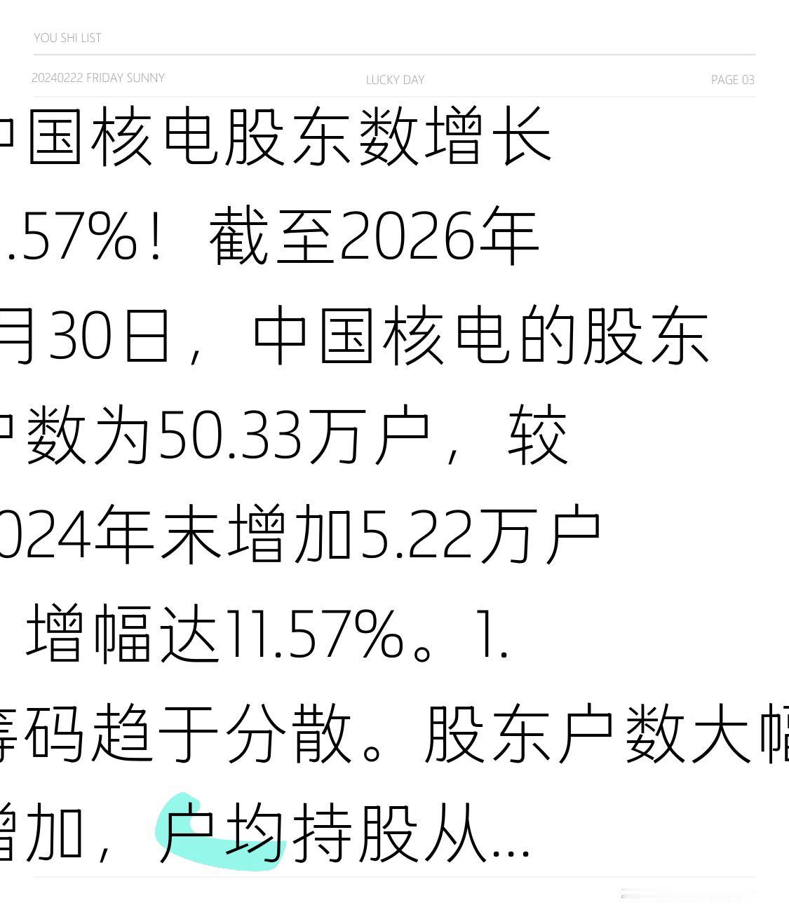中国核电股东数增长11.57%,意味着啥? 截至2026年1月30日,中国核电的股东户数为50.33万户,较2024年末增加5.22万户,增幅达11.57%。 1. 筹码趋于分散。股东户数大幅增加,户均持股从4.56万股降至4.09万股,说明筹码正从机构或大户手中向散户分散。这通常不是强势信号,因为散户持股分散,容易导致股价波动加剧。 2. 市场热度上升。股东数暴增,说明近期公司关注度显著提升,大量散户涌入。这可能与市场行情、公司利好消息或板块轮动有关,但也意味着短期获利盘增加,抛压风险在累积。 3. 户均持股市值参考。35.19万元的户均持股市值,符合中大盘股的散户参与特征,进一步印证了当前散户化的趋势。 在当前筹码分散的背景下,若你持有这只股票,更适合用长期配置的思路应对,而非短期博弈。 需要警惕的是,筹码分散阶段股价容易随情绪波动,追高风险较大,耐心等待筹码重新集中的信号会更稳妥。