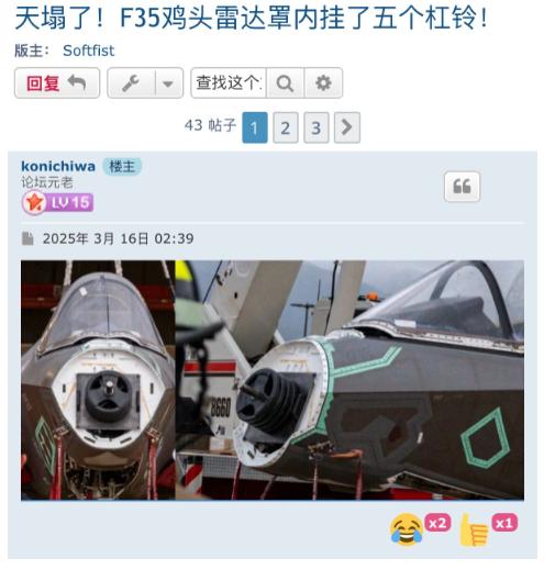 F35居然成了举重运动员了。 在鸡头上面配杠铃,这是想玩中国的铁线拳吗? 但是玩铁线拳你这个又少了点,没有抗击打能力。 莫不想学《西游降魔》中的段小姐,可以把它飞出去当暗器。 我突然想起,这个地方不是应该装雷达的吗? 它的雷达去哪儿了? 哦,还在工厂。 为什么不给它装上呢? 还在等55个国家组成的稀土反中联盟加油,等日本从海底挖稀泥巴,再来提炼稀有元素呢。 哦,那没问题了。 点右上角关注我,我们一起去看这个魔幻的世界