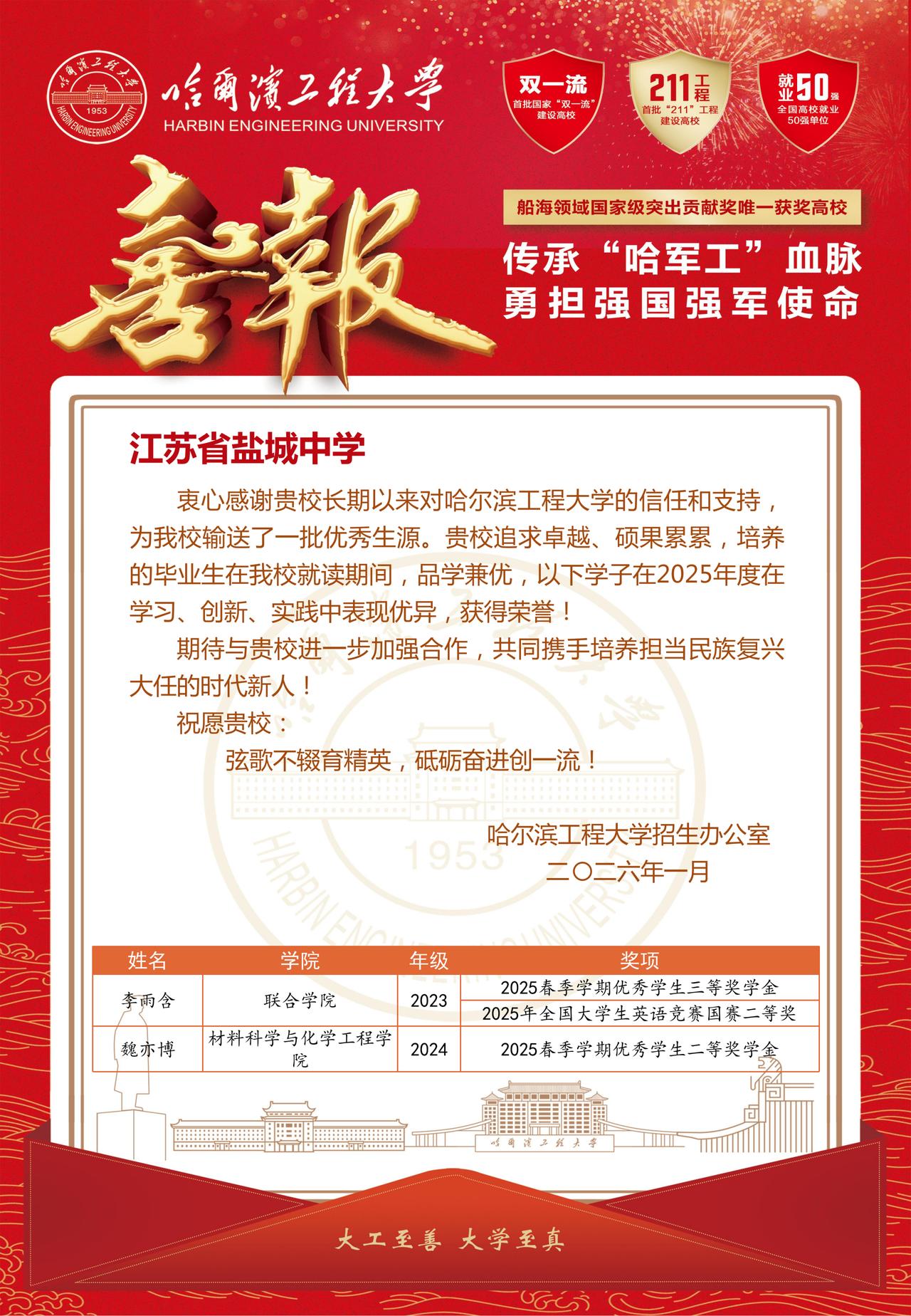 盐中学子再拿硬核喜报!哈工程发来认证🎉 盐城中学的宝子们又给母校长脸啦!哈尔滨工程大学这所 “军工血统” 的 211、双一流高校,专门发来喜报,点名表扬盐中学子李雨含、魏亦博在大学里的亮眼表现! ✨ 学霸战绩速览 李雨含同学拿下全国大学生英语竞赛国赛二等奖+ 优秀学生三等奖学金,英语实力直接拉满! 魏亦博同学斩获优秀学生二等奖学金,材料科学领域崭露头角! 哈工程可是船舶领域的顶尖高校,能在这所强校里拿到国家级竞赛奖项和奖学金,足以证明盐中学子的扎实功底和超强综合能力💪。 这不仅是对两位同学的肯定,更是盐中与哈工程多年合作育人的成果。想走军工、船舶、材料等硬核赛道的盐中宝子们,这波直系学长学姐的经验直接给你们铺路了! 快来评论区沾沾学霸喜气,聊聊你最想报考哈工程的哪个硬核专业👇 盐城中学 哈尔滨工程大学 喜报 军工高校 学霸来袭升学规划[话题] 理工科院校[话题] 名校[话题] @冯哥说升学