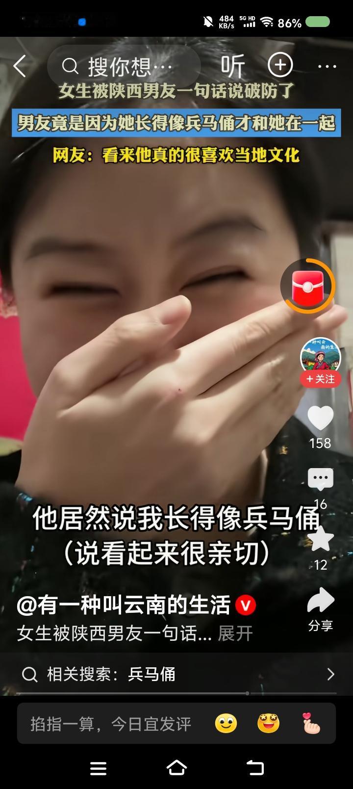 陕西人这么夸人?—— 据报道,一女子吐槽:“我对象是陕西的,我问他为什么娶我,我原以为他会说我好看,温柔,或有趣,不料,他说我长得像兵马俑!” 点评: 陕西人这么夸人?好! 我觉得兵马俑挺好看的呀。厚重,大气,威武,沧桑,我一看就掉眼泪。没有比这更高的夸奖了!现在的女孩很多烟熏胭脂色,实在是没有底蕴。