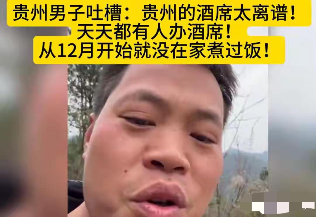 贵州男子吐槽连吃一个多月酒席,家里锅碗瓢盆都生锈了。从12月开始,男子说村里的酒席就不断,结婚、生孩子、过生日、做寿、老人、乔迁等等,各种事由,不是东家,就西家,整天不是在吃酒席,就在吃酒的路上,家里基本没开过火做饭。除了吃了一身膘,钱包也是彻底遭不住。他是单身,随礼不多,有些村里的老人没啥收入,因为乡里乡亲,不得不去,弄得苦不堪言。办酒席陋习 酒席上的情景 酒席