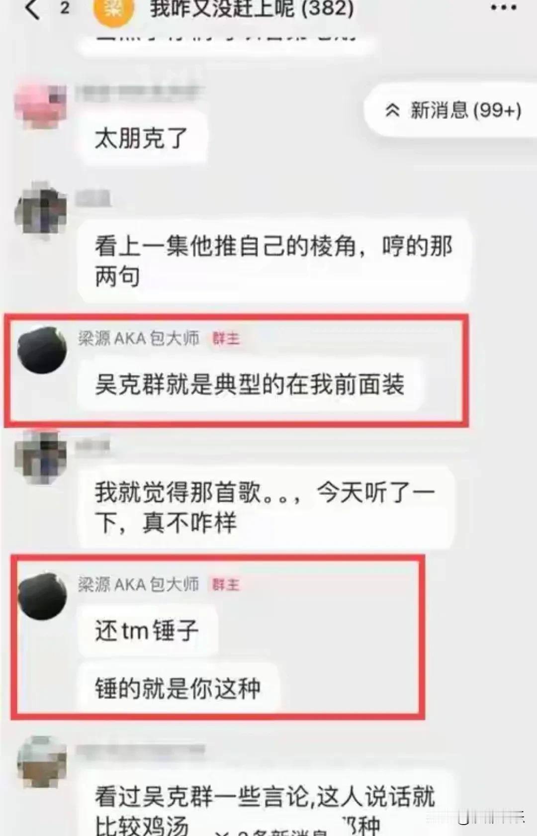 台上点评犀利,台下粗口泄愤,这届乐评人是不是把“没素质”当成了“真性情”? 最近《有歌》第二季火了,不是因为歌,而是因为一场“骂战”。乐评人梁源批评欢子和吴克群合作的《棱角》,说歌里全是“小气的抱怨”。吴克群站出来解围,说“棱角不是伤人的工具”,乐评人该是“导游”,而不是看啥都是钉子的“锤子”。 这话说得挺在理。结果呢?梁源老师节目后越想越气,直接发微博说吴克群“在我面前装”。这还没完,网上流出的聊天截图更惊人,他在几百人的群里直接开骂,用词相当粗鄙。好家伙,台上满嘴艺术原理,台下满口“TM”,这变脸速度比翻书还快。 反观吴克群,被骂“装”之后没对骂,转头默默发新歌、跑演出、搞AI音乐大赛。谁在认真做音乐,谁在单纯发泄情绪,一目了然。 乐评当然可以说真话,但真话不等于脏话,犀利也不等于刻薄。把自己当“锤子”到处敲打,看谁都不顺眼,那不是专业,是得了“看什么都像钉子”的病。观众的眼睛是雪亮的:一个在冲突后持续输出作品,一个在冲突后持续输出情绪和粗口。这场闹剧,谁赢了体面,谁输了格局,不用多说了吧? 说到底,音乐需要的是能指路的“向导”,而不是只会砸人的“锤子”。把刻薄当深刻,把人身攻击当行业清醒,这才是华语乐坛最该“棱角分明”去反对的坏风气。 梁源吴克群因点评《棱角》发生冲突 吴克群