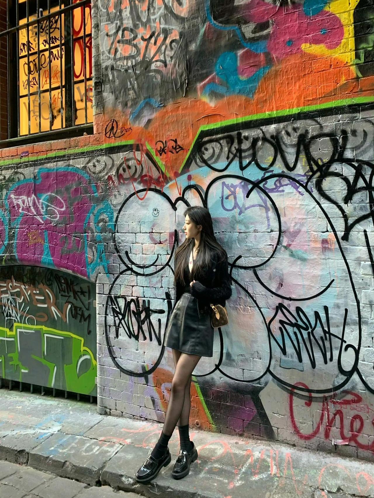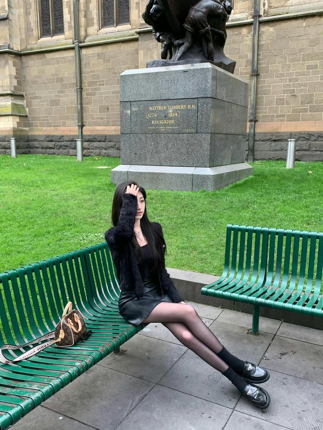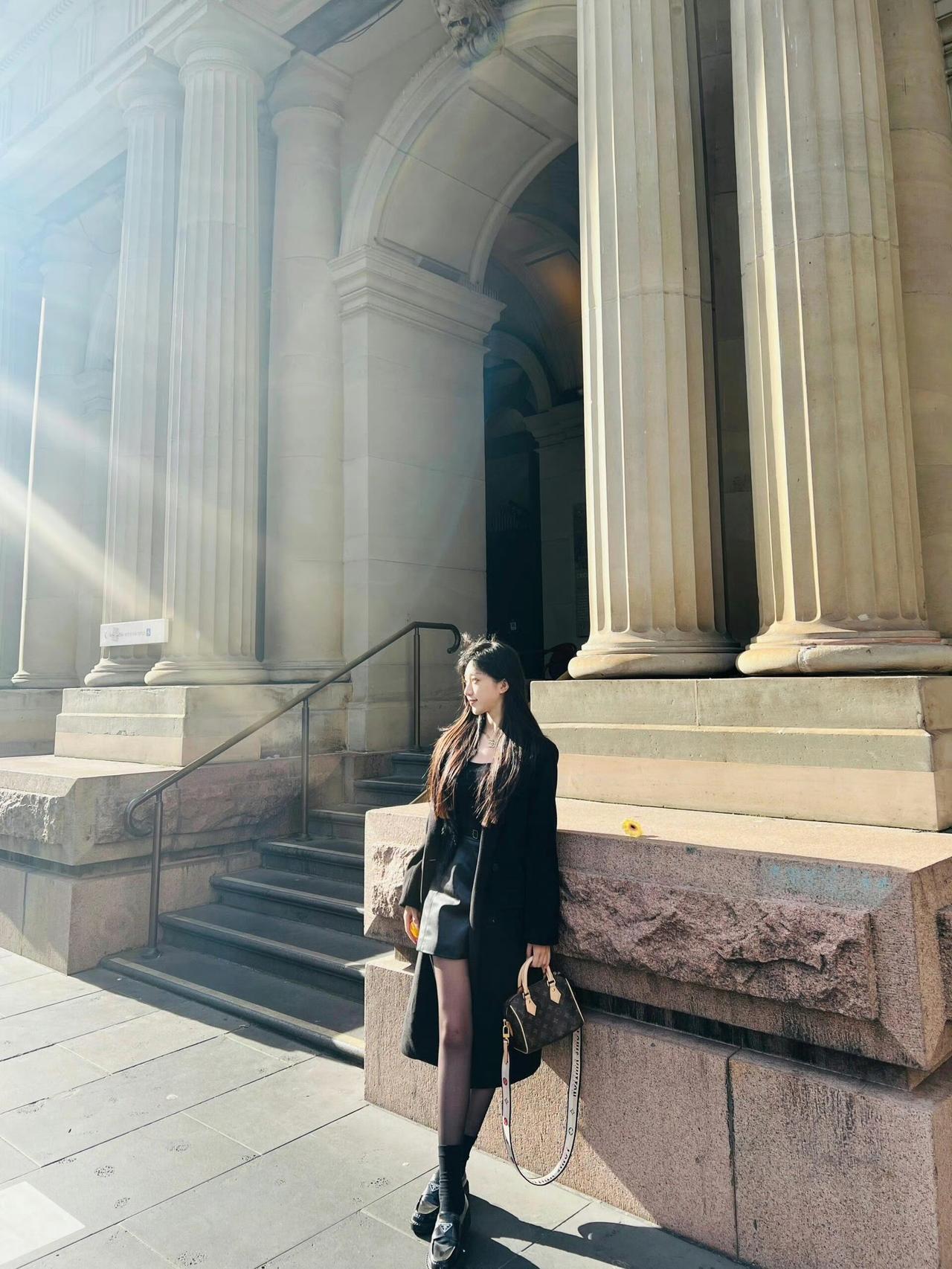这套是暗黑甜酷风,很适合秋冬的户外休闲/街拍场合~ 核心单品是黑色短款毛绒外套+皮质短裙,毛绒材质增加了温暖的慵懒感,皮质元素又带出酷飒气场;搭配厚底乐福鞋,再加上经典老花包,甜酷中还带了点复古贵气,和背景的复古建筑也很适配。黑色系穿搭