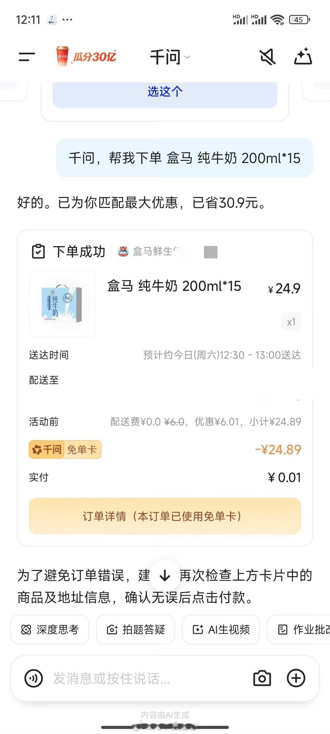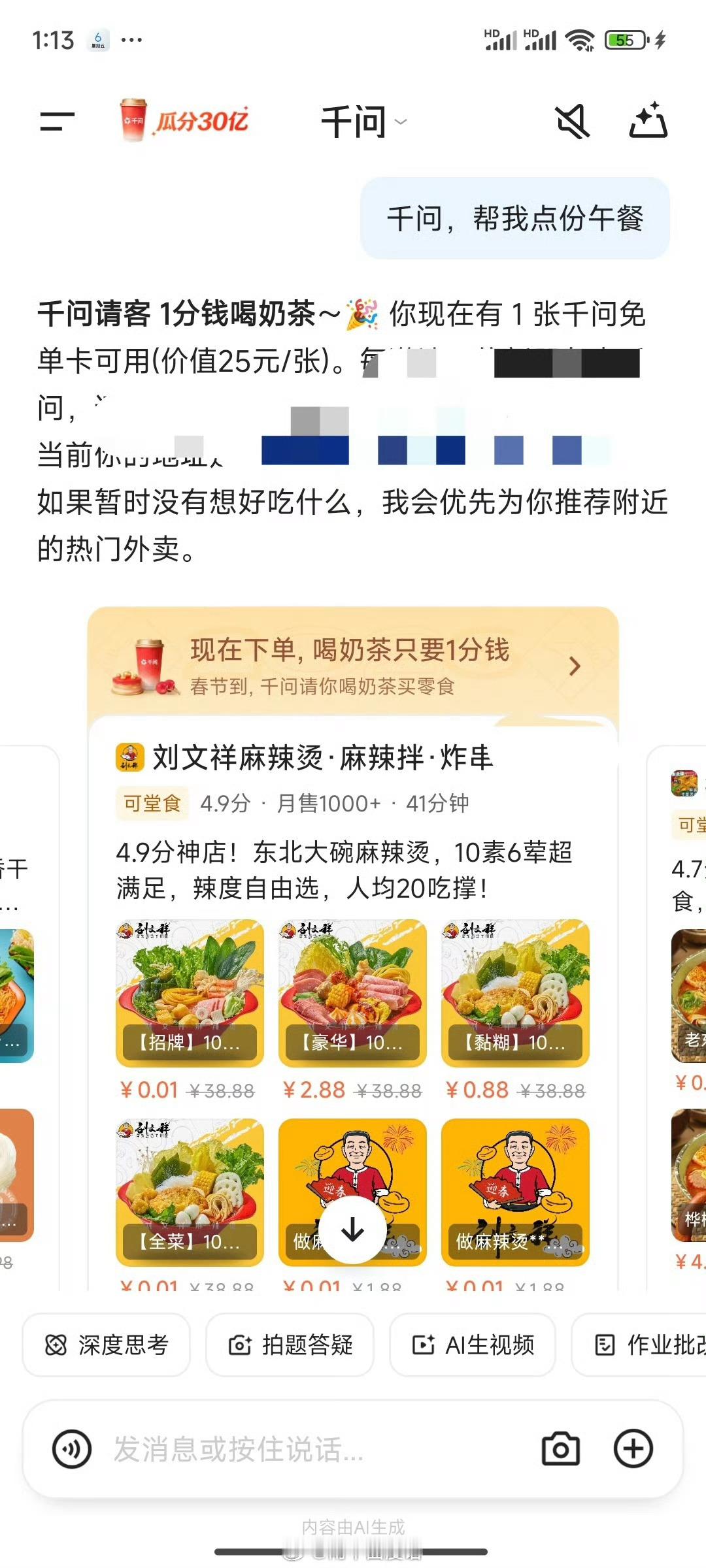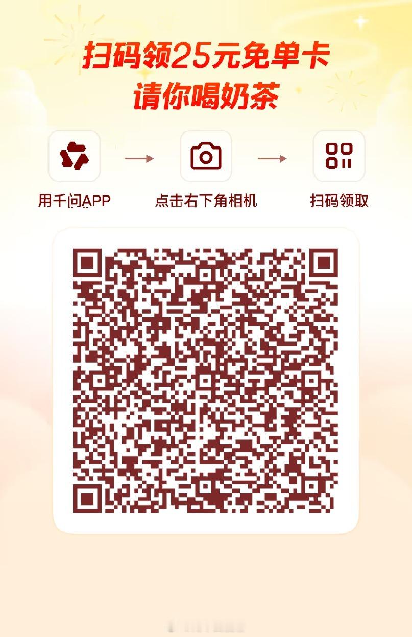 千问千问免单还在进行中。亲测有效!我已经用券免费get麻辣烫和牛奶。快来薅羊毛!麻辣烫、炸鸡、各种外卖也都可以用。免费的为什么不要?薅羊毛方法:扫图一码即可领取25元代金券。扫码领券后让千问帮你点你想要的东西,即可使用25💰券啦!
