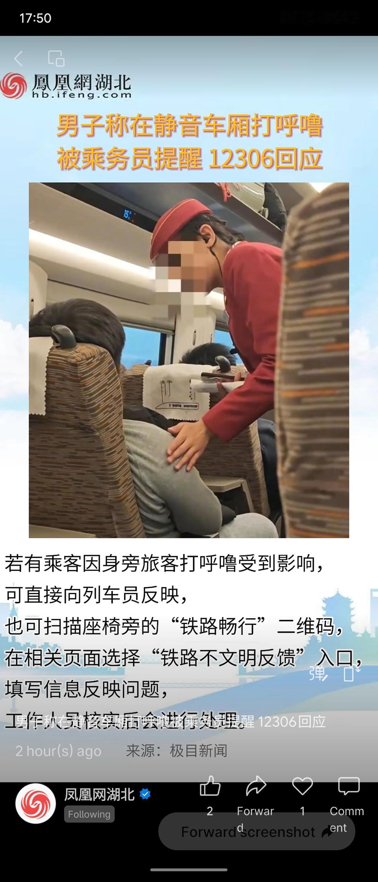 一男子在动车静音车厢因打呼噜被乘务员提醒。12306回应称,若打呼声音过大影响他人,工作人员会进行提醒;受影响乘客也可通过扫码反馈。此举既维护了静音车厢秩序,也体现了对旅客生理现象的合理包容,平衡了公共规则与人际体谅。