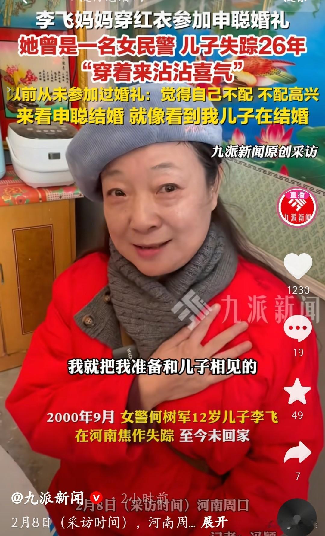 李飞的母亲何树军,特意穿上了一身红衣服,去参加申聪的婚礼。 她以前从来没参加过别人的婚礼,总觉得自己不配高兴,不配去沾这份喜气。可这次不一样,她看着申聪和爱人拜堂,就像看到自己的儿子李飞在结婚一样。 2000年9月,12岁的李飞在河南焦作失踪,那天他揣着30块钱,准备去给自行车配锁,出门后就再也没回来。何树军是一名女民警,儿子失踪后,她把所有精力都放在了寻子路上,这一找就是26年。 她把准备和儿子相见时穿的红衣服,先穿去了申聪的婚礼,她说就当是提前沾沾喜气,盼着自己的儿子也能早点回家。 26年了,她从青丝等到白发,从壮年等到花甲,可心里的那团火从来没灭过。她还在等,等着李飞能像申聪一样,有一天推开家门,喊她一声“妈”。 希望李飞早点回家,希望所有失散的家庭,都能迎来团圆的那一天。