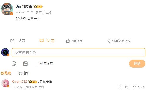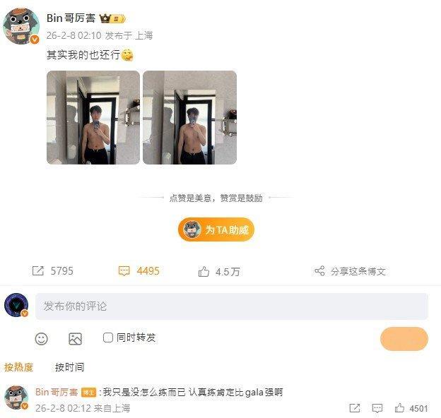 1月29日|Bin哥背起书包离队,随后道歉滑跪回归2月6日|BLG不敌AL丢掉常规赛第一,Bin哥反手发博:"我依然是世一上"2月8日|Gala晒腹肌,Bin哥不甘示弱发身材照:"认真练肯定比Gala强"