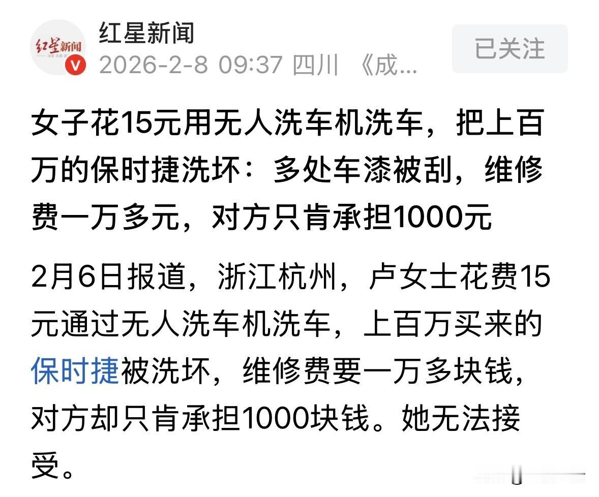 浙江杭州,保时捷女车主花15元用无人洗车机洗百万豪车,结果洗完她傻眼了,车衣破了不说,车子多处车漆也被刮掉了,光维修费就要1万,她找店家索赔,对方只肯赔1000,并表示目前洗车技术还没那么先进。 卢女士的座驾是一辆保时捷,当初落地花了上百万。 2月6号这天,卢女士看车有点脏,就寻思洗一洗。 现在有很多那种无人值守的自动洗车机,投个币或者扫个码,十几块钱就能把车洗得锃亮,图的就是个方便省钱。 卢女士正好路过一个无人洗车站,一看价格:15块。也就是一杯奶茶钱,太划算了! 卢女士没多想,就把车开进去了。她觉得,机器洗车嘛,程序都是设定好的,能出啥岔子? 所以开进去时,她是放了一百个心的。结果等洗完,她后悔万分。 当时洗车机轰隆隆一响,大刷子呼呼地转,卢女士坐在车里还没啥感觉,等洗完出来下车一瞧,整个人愣在原地了。 只见自己那辆百万保时捷,前保险杠上好几道印子,漆都刮没了,露出底下的塑料底漆,轮眉那边也是伤痕累累。 最惨的是后视镜和车身侧面的车衣,直接被扯破了,像被狗撕过似的。 卢女士当场不淡定了,围着车转了三圈,越看越闹心。 她赶紧找了个修配厂问价,这一问更是透心凉。修配厂师傅说,这伤得重做漆,还得换车衣,前前后后加起来,没个1万多块钱下不来。 图便宜花15洗车,结果搭进去1万多维修费,卢女士觉得这事儿绝对不能就这么算了。 卢女士气呼呼地找到洗车场的负责人,是一个技术部的经理。 她开门见山,说这洗车机是你们放的,钱是你们收的,把我车洗坏了,你们必须全责! 她本以为对方会赔礼道歉,赶紧谈赔偿,谁知道对方的态度让她大跌眼镜。 对方经理是个男的,面对卢女士的质问,那是一脸的无奈,说出来的话能把人噎死。 他就这个设备,我们还在改进中,毕竟技术还没有那么先进,出点小毛病难免的。 卢女士一听火气更大了,技术不先进就敢拿出来赚钱?把我车刮成这样叫小毛病? 而且说到赔钱的事儿,更是让卢女士血压飙升。 经理说关于赔偿,我们也不是不赔,但这责任怎么划分还得研究。这样吧,我们于人道主义,最多能承担1000块钱。” 1000块?维修费要1万多,你赔1000?这不是打发叫花子吗? 卢女士当时就在现场炸了,说我这车漆是原厂的,车衣也是贴的好的,1万多是实打实的定损价。你一句技术不先进就想赖账?1000块连个补漆的零头都不够! 但不管卢女士怎么吵,怎么讲道理,对方就咬死了技术限制和最多赔1000这两点。 经理甚至还暗示,是不是卢女士自己停车没停正,才导致机器刷坏了车? 这话把卢女士气得差点背过气去。她明明是按着标线停的,而且洗车过程完全正常,没动过车。现在车坏了,店家不仅不认账,还反咬一口,这上哪说理去? 如今这网上也是议论纷纷。有人说卢女士心大,百万豪车敢交给只收十几块的机器洗。也有人觉得店家太坑。 咱们说句公道话,做生意讲究个诚信。你把机器摆出来收钱,就默认这机器是安全可靠的。如果机器有缺陷,容易伤车,你就得在显眼位置贴警告,或者干脆别用。 现在出了事,拿技术不先进当挡箭牌,这肯定说不过去。 卢女士现在是一肚子委屈没处撒。车还在那儿停着,看着那一道道划痕就心疼。她已经打算走法律途径了,找消协、找市场监管局,甚至起诉。 便宜虽好,但得看是什么便宜。像这种无人监管的设备,涉及到安全和财产损失的,还是得留个心眼。万一真出了事,维权的成本可能比省下来的钱要高得多。 《消费者权益保护法》第48条规定:经营者提供商品或者服务有下列情形之一的,除本法另有规定外,应当依照其他有关法律、法规的规定,承担民事责任:商品或者服务存在缺陷的;服务的内容和费用违反约定的;对消费者提出的修理、重作、更换、退货、补足商品数量、退还货款和服务费用或者赔偿损失的要求,故意拖延或者无理拒绝的。 洗车店作为经营者,收取了卢女士15元费用,双方即形成了服务合同关系。洗车店提供的无人洗车机属于其提供的服务范畴。 首先,洗车机导致百万豪车多处刮擦、车衣破损,直接证明该服务存在严重的“缺陷”,即设备安全性不达标,未能达到保障消费者财产安全的基本要求。 根据第48条第1项,经营者必须对因服务缺陷造成的损害承担赔偿责任。 其次,技术落后不能成为免责理由,反而证明其设备维护或选型存在过错。 最后,关于赔偿金额,法律规定应赔偿消费者的实际损失。卢女士的车辆维修费经定损为1万多元,这是直接损失。 洗车店仅愿赔偿1000元属于“无理拒绝”足额赔偿,违反了该条第八项的精神。洗车店不能因收费低廉而免除其对高价值车辆的安全保障义务,必须按照实际损失进行全额赔付。 对于这件事,你怎么看? 欢迎关注@一案一论