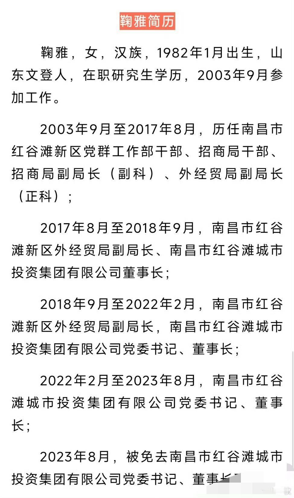 这个山东大妹子在江西轻轻松松弄了4900多万。鞠雅1982年生,2003年起步,26岁成为副科,35岁成为南昌红谷滩城投董事长。那个年代的城投绝对的肥水部门,不差钱,所以她捞钱也快。公开活动的照片,都是光彩照人,像个小姑娘。进去后接受采访的视频,简直判若两人了。权力、钱真的是最好的保养品。2023年被判刑8年,罚金100万。南昌金融美女 鞠琬婷