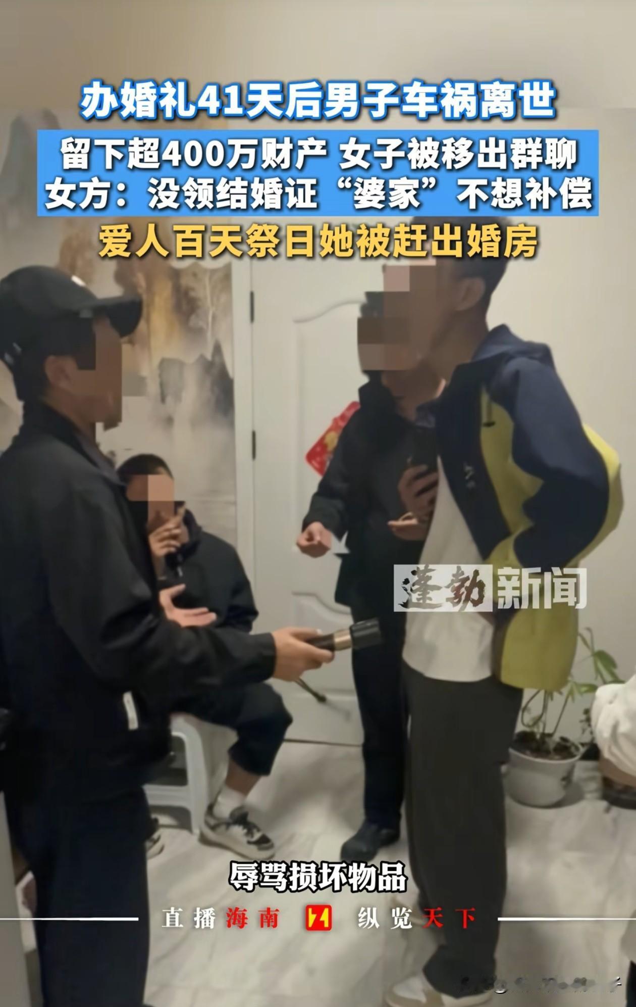 “太亏了!”山西一女子与丈夫新婚不久,丈夫便因车祸去世,留下近400万的遗产,婆婆却不愿分给儿媳,又让女子返还聘礼的钱,最后还让她搬离新房,双方因此闹上了法庭。 婆婆认为,女子没有和儿子领证,就不算是她的儿媳,自然就不能分财产! 而女子则解释说,她和丈夫两人的婚事双方家长都同意,办了订婚宴,也共同举办了婚礼,只是因为有事耽误了,他们才没有去领证的。 丈夫去世时,婆婆也让她以妻子的身份出席丈夫葬礼,而且村里的人都知道她是他们家的新媳妇,现在因为钱就不认她这个儿媳,太不近人情了! 不仅如此,丈夫的弟弟还带着亲戚,晚上闯进她和丈夫的新房,拿着喇叭骂她,这是他家的房子,让女子搬走。 女子和丈夫没领证,按规定确实没有资格分财产,但讲法的同时也得讲情理,不是女子不愿领证,而是男方因为找新工作面试耽误了,所以才导致的。 个人认为,400万应该适当分一点给女子,毕竟两人一起生活了2年多,相信丈夫也不愿意看到这样的结局,您觉得呢?