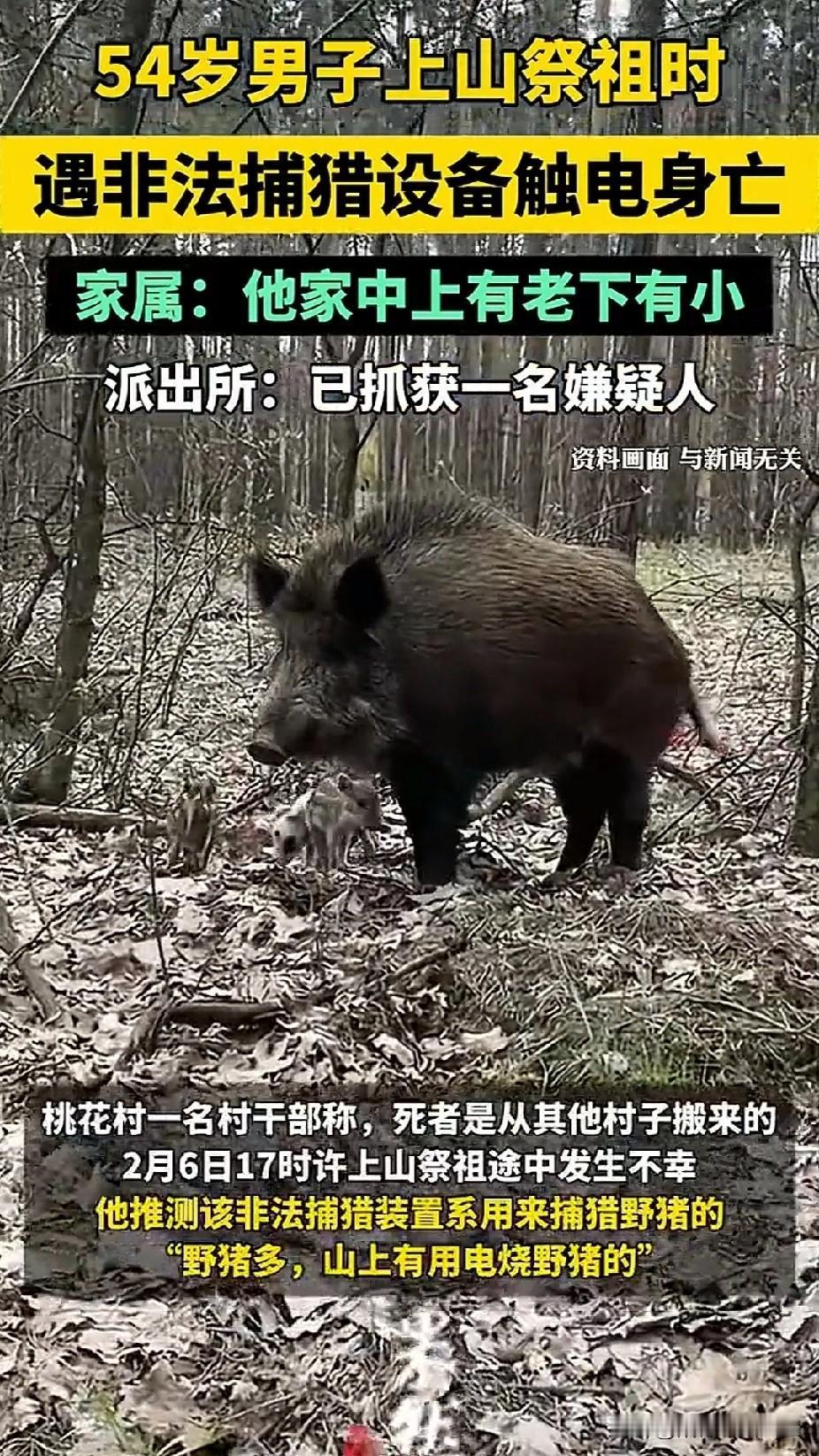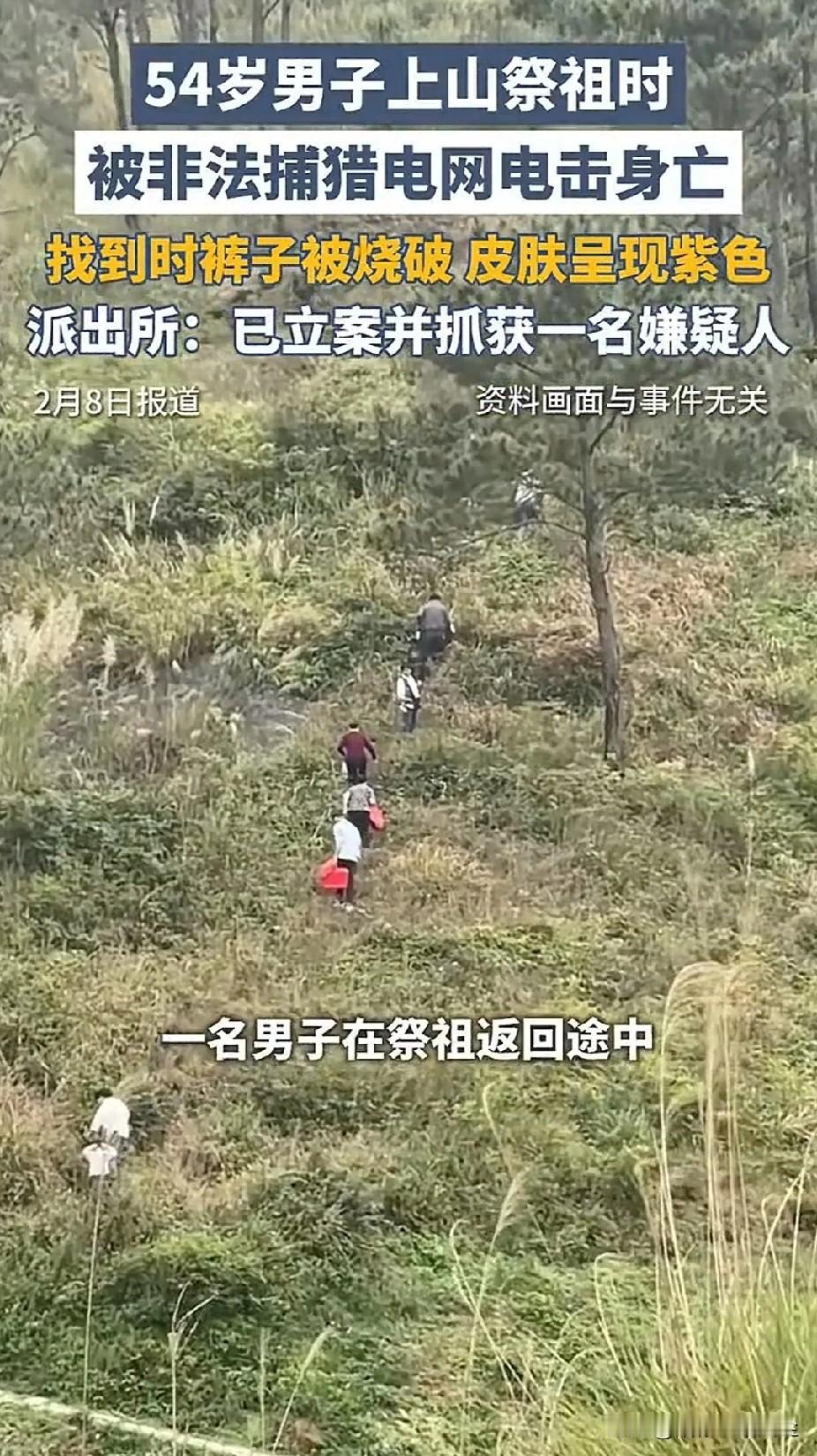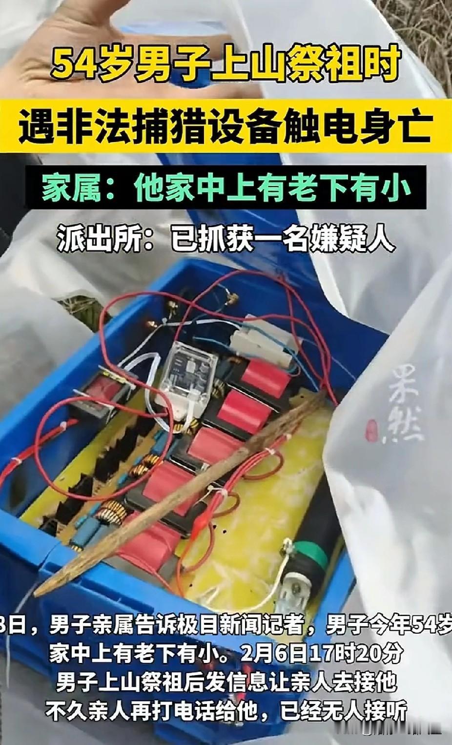 摊大事了!重庆54岁男子上山祭祖时,遇非法捕猎设备触电身亡,家属崩溃痛哭:他还上有老下有小,是一家人的顶梁柱。 天有不测风云,人有旦夕祸福。 谁都以为意外离自己很远,却不知它可能就在毫无防备的瞬间,彻底击碎一个家庭的所有期盼。 2月6日下午17点20分左右,重庆市巫山县抱龙村镇桃花村,一名男子决定上山祭祖,上山前,男子还特意叮嘱家属来接自己。 谁料在返回途中,突然发生意外身亡,被非法设置的捕猎电网装备击中。 不久,家属再打电话给他,发现电话无人接听。 一下慌了神的家属,立马上山寻找他,等找到时才知道为时已晚,人早已经没气了。 男子静静地倒在路边,身旁还有捕猎装置,膝盖处的裤子被烧破成洞。 很恐怖的是,男子全身皮肤呈现紫色,很明显是触电身亡。 很难想象,在生命的最后那一刻,男子究竟遭遇了什么? 见男子因触电身亡,家属当场崩溃痛哭: “他还上有老下有小,是一家的顶梁柱啊!怎么能说没就没了?” 据家属透露,造成54岁男子身亡的罪魁祸首,就是私设的电网捕猎装置。 有人将肇事电网设在一米宽的山路上,藏在草丛中的布置十分隐蔽,且无任何标识,很难让人看见。 据悉,涉事的电网高达上万伏,怪不得能让男子连发消息呼救的机会都没有,真的太吓人了。 村干部表示,该地区野猪多,常下山来祸害庄稼,推测该非法装置是用来捕获野猪的。 2月8日上午,辖区派出所工作人员称,已对该事件已立案,并抓获一名嫌疑人。 目前,家属正在料理后事,也一定会追究对方的责任。 这名捕猎者,这回真正算摊上大事了! 写在最后: 为了一己私利,将如此危险的致命装置,随意摆放在村民日常通行的山路上,其漠视生命安全的态度,简直令人发指。 任何个人利益,都不能凌驾于生命安全之上。不要抱着任何心存侥幸的违法行为,最终都难逃过法律的严惩。 临近春节了,我在此也提醒每一位上山祭祖者,进山时务必提高警惕,远离不明危险区域,守护好自身安全。 愿逝者安息,家属早日走出伤痛,希望严惩肇事者,用以告慰死者在天之灵! 消息来源于《果然视频》