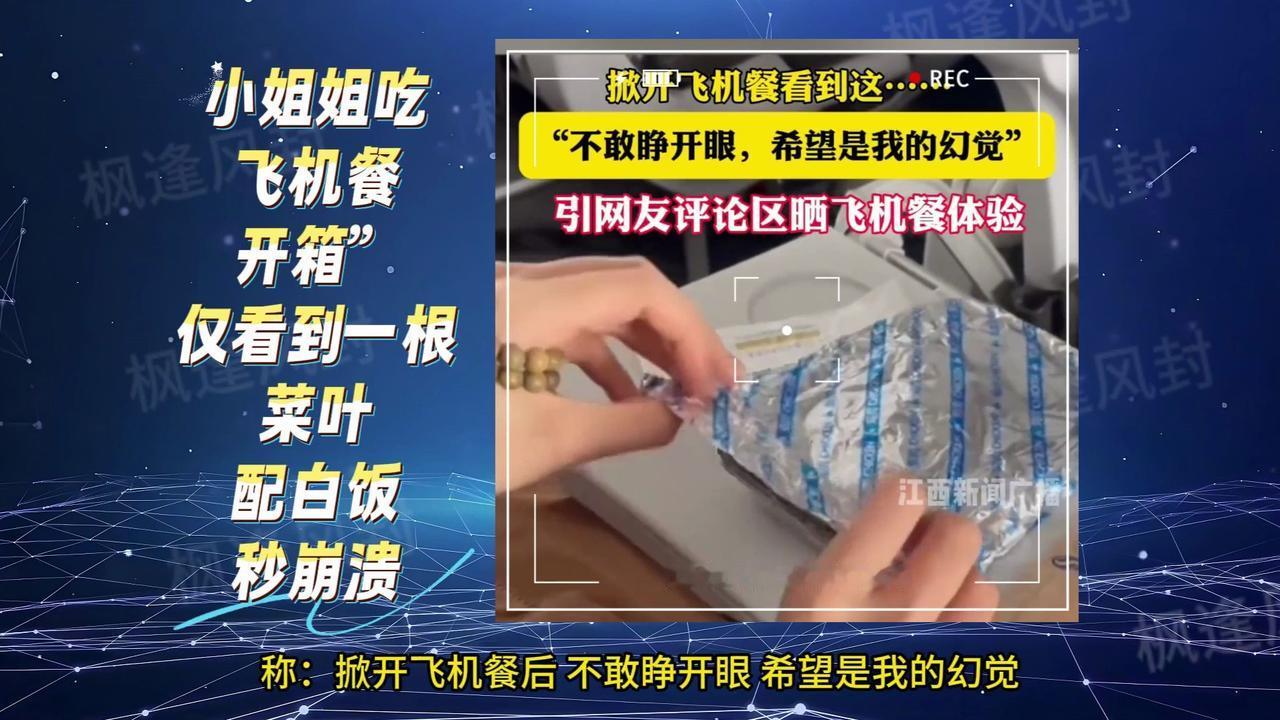 女子吐槽飞机餐仅1根青菜配米饭,热搜第一后反转太意外 2月7日,女子发vlog吐槽,打开飞机餐瞬间傻眼——满满一盒米饭,搭配的只有孤零零1根青菜,配文“不敢睁开眼,希望是我的幻觉”,画面冲击力拉满。 视频一出瞬间炸锅,网友吵翻了:有人吐槽“这餐食还不如泡面”,有人质疑摆拍博眼球,还有人晒出自己遇到的极简飞机餐,各种离谱吃法层出不穷。 很快涉事航司(浙江长龙航空)回应,客服称“不可能只有1根青菜”,且未收到相关投诉。 更反转的是,当事人看到话题爆了直接慌了,发视频澄清“我没说啥,别搞我”,还晒出正常航餐配文“我爱航餐”,目前原吐槽视频已隐藏。 其实近年多家航司压缩餐食成本,甚至取消免费餐食,网友不满的从来不是简餐,而是这种“隐形缩水”不透明。你坐飞机遇到过离谱飞机餐吗?