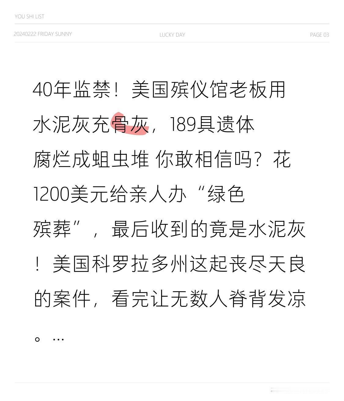 40年监禁!美国殡仪馆老板用水泥灰充骨灰,189具遗体腐烂成蛆虫堆 你敢相信吗?花1200美元给亲人办“绿色殡葬”,最后收到的竟是水泥灰!美国科罗拉多州这起丧尽天良的案件,看完让无数人脊背发凉。 2023年10月,一个小镇居民忍无可忍报警:镇上一栋建筑飘出刺鼻恶臭,连窗户都爬满驱虫。谁能想到,当调查人员破门而入,眼前的场景堪称人间炼狱——189具遗体层层叠叠堆在室温房间里,有老人、婴儿甚至未足月的胎儿,腐烂液体浸透地板,蛆虫在尸体间肆意爬行,部分遗体堵塞房门,连调查人员都无法顺利进入。 更让人崩溃的是,这些死者的家属,还捧着所谓的“亲人骨灰”在家祭拜。而他们不知道,自己珍视的骨灰盒里,装的全是廉价水泥灰。经营这家“回归自然”殡仪馆的老板乔恩·哈尔福德,打着环保殡葬的幌子,向每个家庭收取1200到1895美元不等的费用,却把遗体像垃圾一样丢弃,转头用骗来的钱买12万美元豪车、3.1万美元加密货币,甚至还去做激光塑形! 这起持续4年的骗局,直到邻居举报才被揭开。法庭上,死者女儿凯莉的哭诉让全场沉默:“我母亲被当成垃圾扔在那里腐烂,我每天都在做噩梦,梦见蛆虫爬满她的身体”。而哈尔福德穿着囚服,全程面无表情,直到宣判前才假意忏悔“用余生赎罪”。 让人震惊的是,当地原本对殡仪馆毫无监管——不用执照、不用专业学位,甚至高中毕业都不需要。检方直言,这起悲剧完全是贪婪驱使,他们花在奢侈品上的钱,足够将所有遗体妥善火化好几遍。最终法官驳回了原本20年的认罪协议,顶格判处哈尔福德40年监禁,前妻也将面临25到35年刑期。 逝者为大,殡葬本是守护最后尊严的底线。可不管是美国的水泥灰骨灰,还是国内偶尔曝光的殡葬乱象,都在刺痛人心。生老病死是每个人的必经之路,我们在乎的从来不是多贵的服务,而是对逝者的尊重、对生者的慰藉。 你怎么看待这起虐尸案?你觉得该如何守住殡葬服务的底线?评论区聊聊你的看法,别忘了点赞转发,让更多人关注这份最后的尊严!