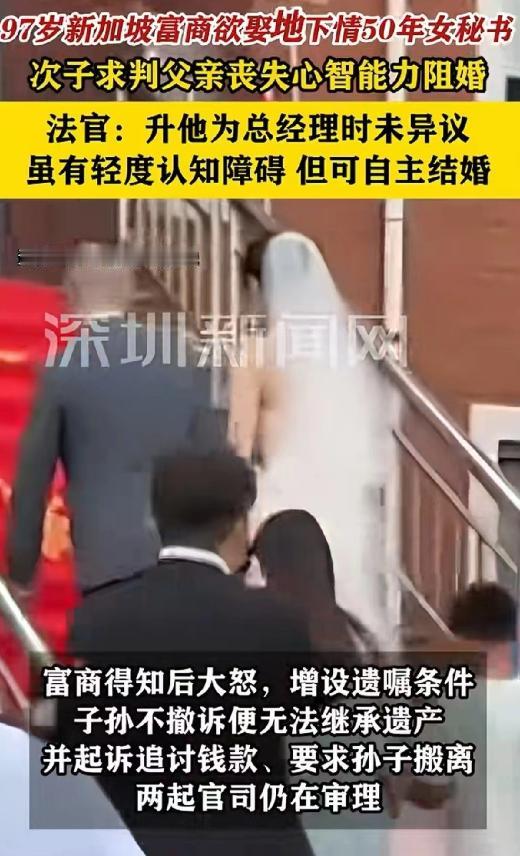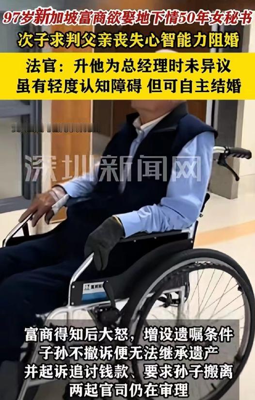太双标了!2月日报道,97岁的富商和女秘书保持了50余年的地下关系,为了人生不留遗憾,富商决定再婚娶女秘书。可谁知,儿子得知这一消息后,直接把老父亲告上法庭,认为父亲2017年跌倒后,患有失智症,请求法院认定他心智不全,不能结婚。法院:2019年富商把儿子升为公司总经理时,儿子怎么不说他心智不全呢?儿子的用意太明显,法院直接驳回诉求。 新加坡出了桩豪门官司,听得人是又生气又唏嘘,一位97岁高龄的富商老爷子,想在人生最后的时光里,给陪伴了自己半个多世纪的女秘书一个名分,正儿八经领证结婚。 这本来是件挺温情的事儿,结果老爷子的亲生儿子不干了,直接一纸诉状把亲爹告上了法庭,理由更是让人大跌眼镜:他说老爹早在几年前就摔坏了脑子,现在是“老糊涂”了,根本没资格决定结不结婚。 这事还得从头说起,这位老爷子年轻时也是个狠人,白手起家挣下了偌大的家业。 早在1971年,他就跟身边的女秘书有了感情,两人风风雨雨走过了50多年,甚至还有了孩子。 原配还在世的时候,虽然知道这事,但为了家里的安稳一直没离婚,直到2014年原配去世,到了2016年,女秘书正式搬进豪宅,悉心照料老爷子的饮食起居,两人的关系在圈子里其实早就不是秘密了。 到了2021年,老爷子都92岁了,觉得自己日子不多了,不想让这个跟了自己一辈子的女人到最后还是个“外人”,就动了结婚的念头,这消息一传出来,家里的二儿子当场就炸了。 在儿子眼里,老爹这哪是想结婚啊,这分明是想分家产啊!这要是领了证,那个女人就成了合法妻子,以后老爹两腿一蹬,家产不得被分走一大块? 为了保住自己的那份利益,儿子想了个损招:他向法院申请,说父亲2017年在家摔了一跤,之后脑子就不行了,得了失智症,现在根本分不清东南西北,是被那个女人蛊惑才想结婚的,他的目的很明确:只要法院认定老头心智不全,这婚就结不成,财产也就安全了。 儿子以为只要咬死“老爹糊涂”这一点,就能稳赢,可他万万没想到,法官的眼睛是雪亮的,直接抓住了他的一个小辫子,把他的脸打得啪啪响。 在庭审的时候,法官发现了一个极其讽刺的细节:就在儿子声称父亲已经“失智”后的2019年,这位富商父亲曾亲自签发命令,把二儿子提拔为公司的总经理,让他手握大权,当时,这个儿子可是高高兴兴地接受了任命,对父亲的决策能力没提出半点质疑,更没说过父亲“糊涂”。 这下逻辑就通了:怎么着?亲爹给你升官发财的时候,你就觉得他英明神武、头脑清晰,轮到亲爹想找个老伴、安排自己晚年生活的时候,你就说他老眼昏花、心智不全了? 这种赤裸裸的双重标准,直接把儿子那点小心思暴露得精光,他根本不是担心父亲的身体,纯粹就是为了争家产。 为了保险起见,法院还专门找了权威机构给老爷子做了医学鉴定,结果显示,虽然90多岁的人了,记性确实差点,反应也没年轻人快,但这都是正常衰老,跟“失智”完全是两码事。 老爷子脑子清醒得很,他清楚地知道结婚意味着什么,也明白这么做会有什么后果,完全具备自己做主的民事行为能力。 法官最后的判决那叫一个大快人心,法官明确指出:人老了不代表就傻了,不能因为老人的决定不符合子女的利益,就给老人扣上“心智不全”的帽子。 子女可以有意见,但没权利干涉父母的婚姻自由,更不能为了钱去恶意抹黑父母的能力,最终,法院驳回了儿子的全部请求,支持老爷子结婚。 这事在网上引起了不小的轰动,大家都说,这儿子吃相太难看,父母把你养大,给你铺路让你当总经理,结果临老了想找个伴,你还要为了钱去阻拦,甚至想剥夺父亲做人的权利,这哪里是孝顺,简直是白眼狼。 97岁的富商,不得不通过一场官司来捍卫自己爱人的权利,这听起来挺心酸,但也给所有人提了个醒:亲情归亲情,利益归利益。 做子女的,得学会尊重父母,别总盯着那点家产,把亲情都算计没了。 只要老人头脑清醒,他们就有权选择自己想要的生活,谁也挡不住。 那些打着“为你好”的旗号,实则是为了自己私利的人,在法律和公理面前,终究是站不住脚的。 对此你怎么看? 信源:深圳新闻网