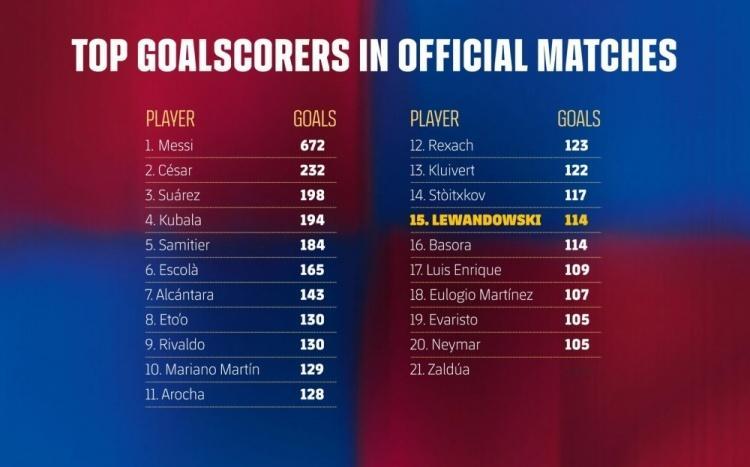 莱万为巴萨打进114球,队史射手榜上追平巴索拉并列第15