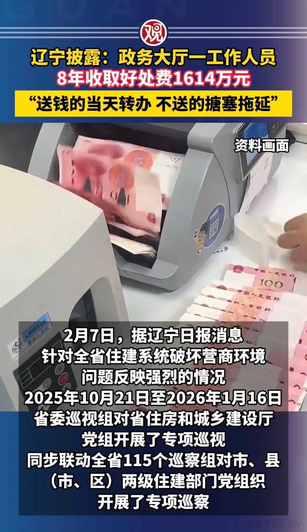 辽宁披露:政务大厅一工作人员8年收取好处费1614万元,“送钱的当天转办,不送的搪塞拖延”