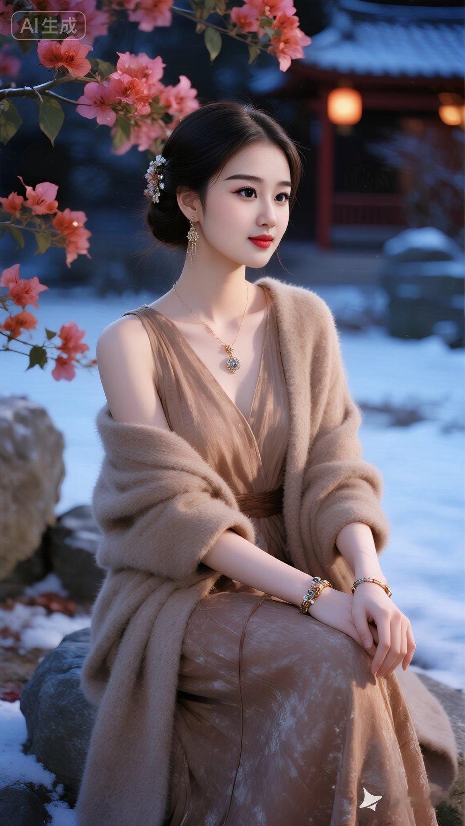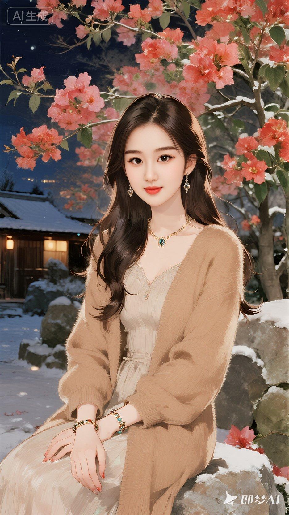 漂亮女孩,披肩长发,圆圆的月亮,皮肤细腻,她穿着浅咖色冬款长袖长裙,裙子。佩戴着精致的耳饰和手链,项链吊坠,妆容精致,面带微笑。坐在石头,三角梅花树下