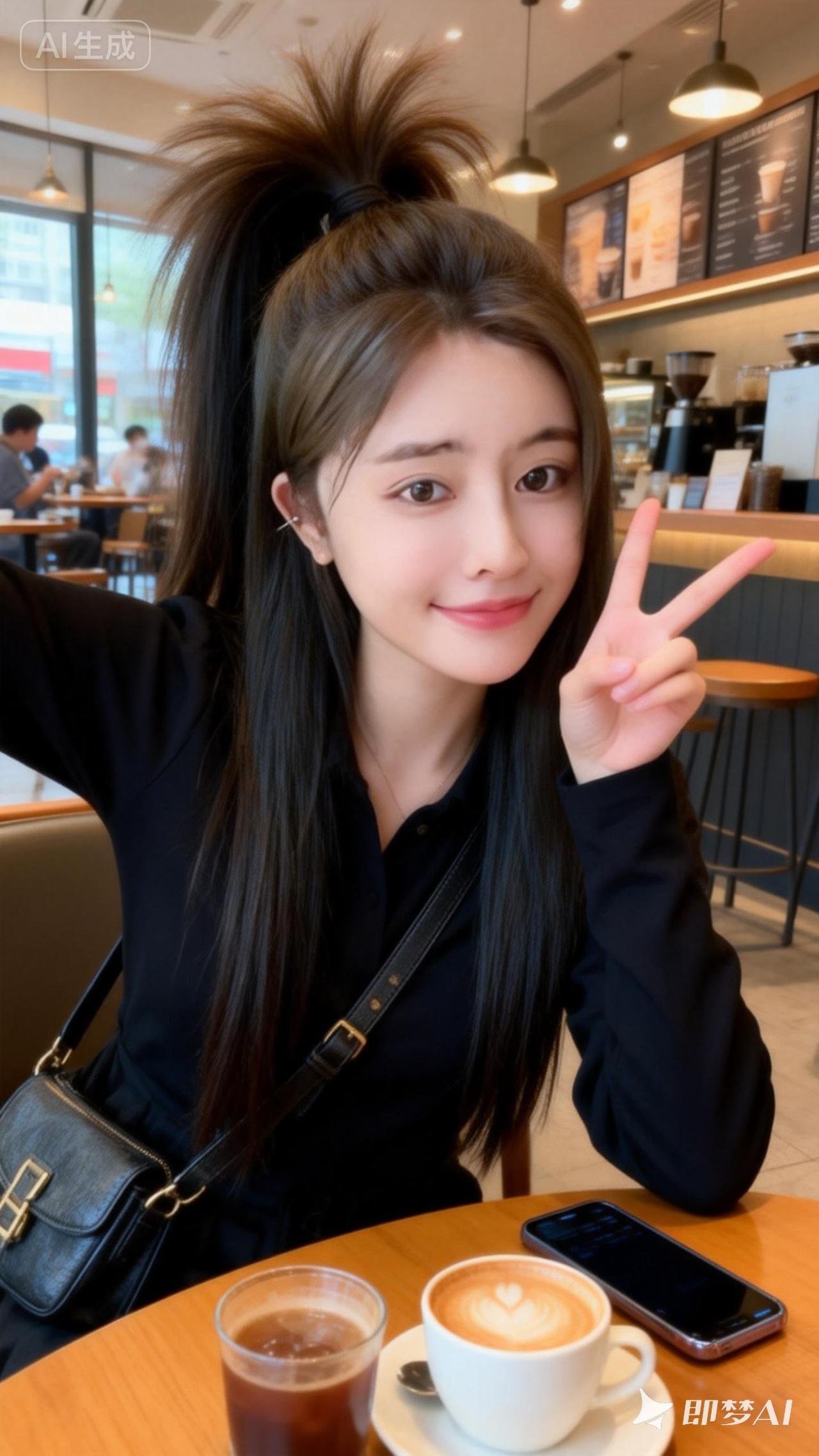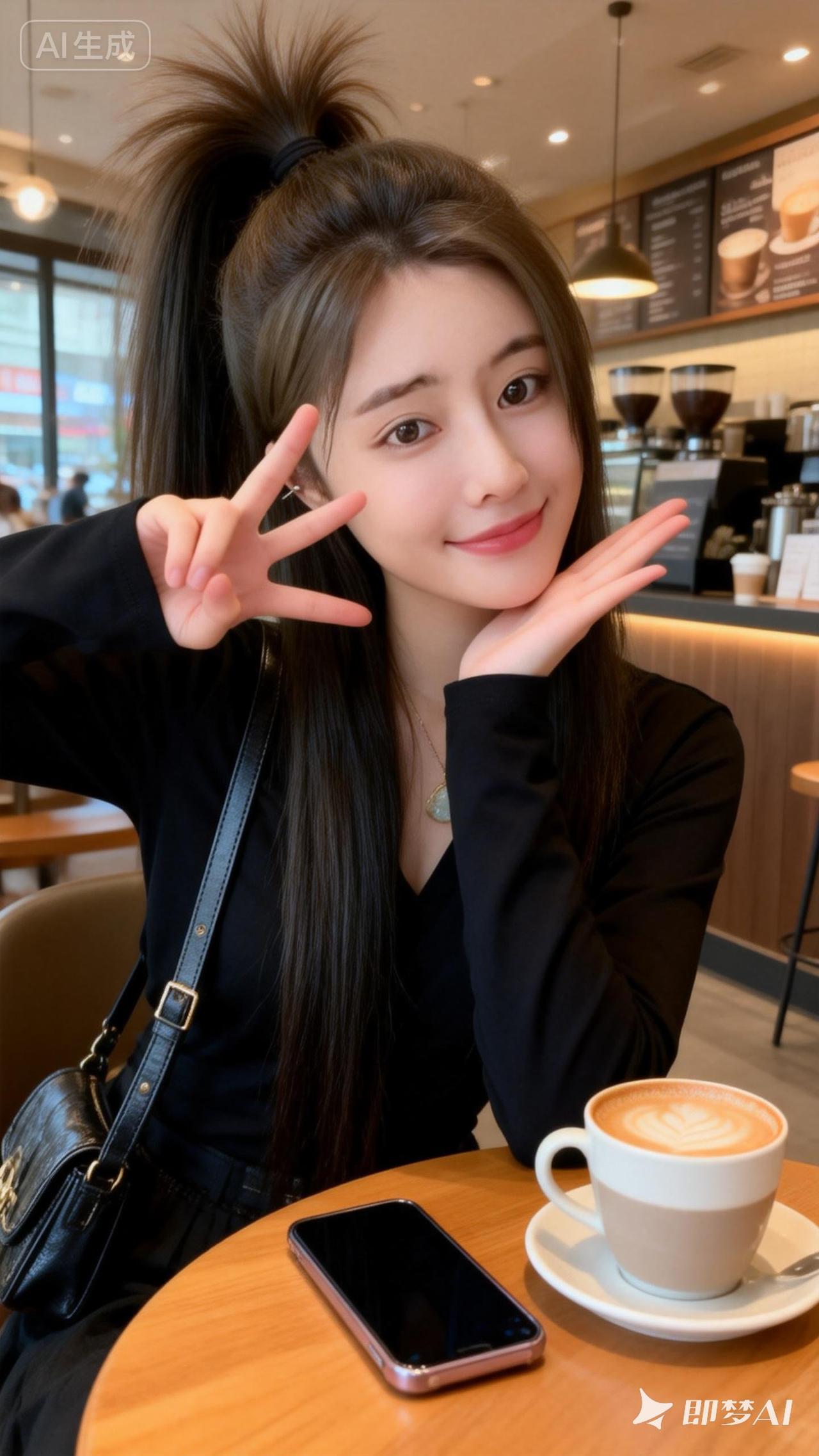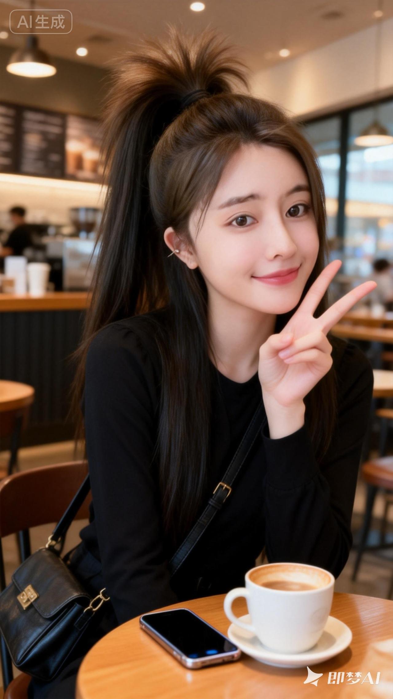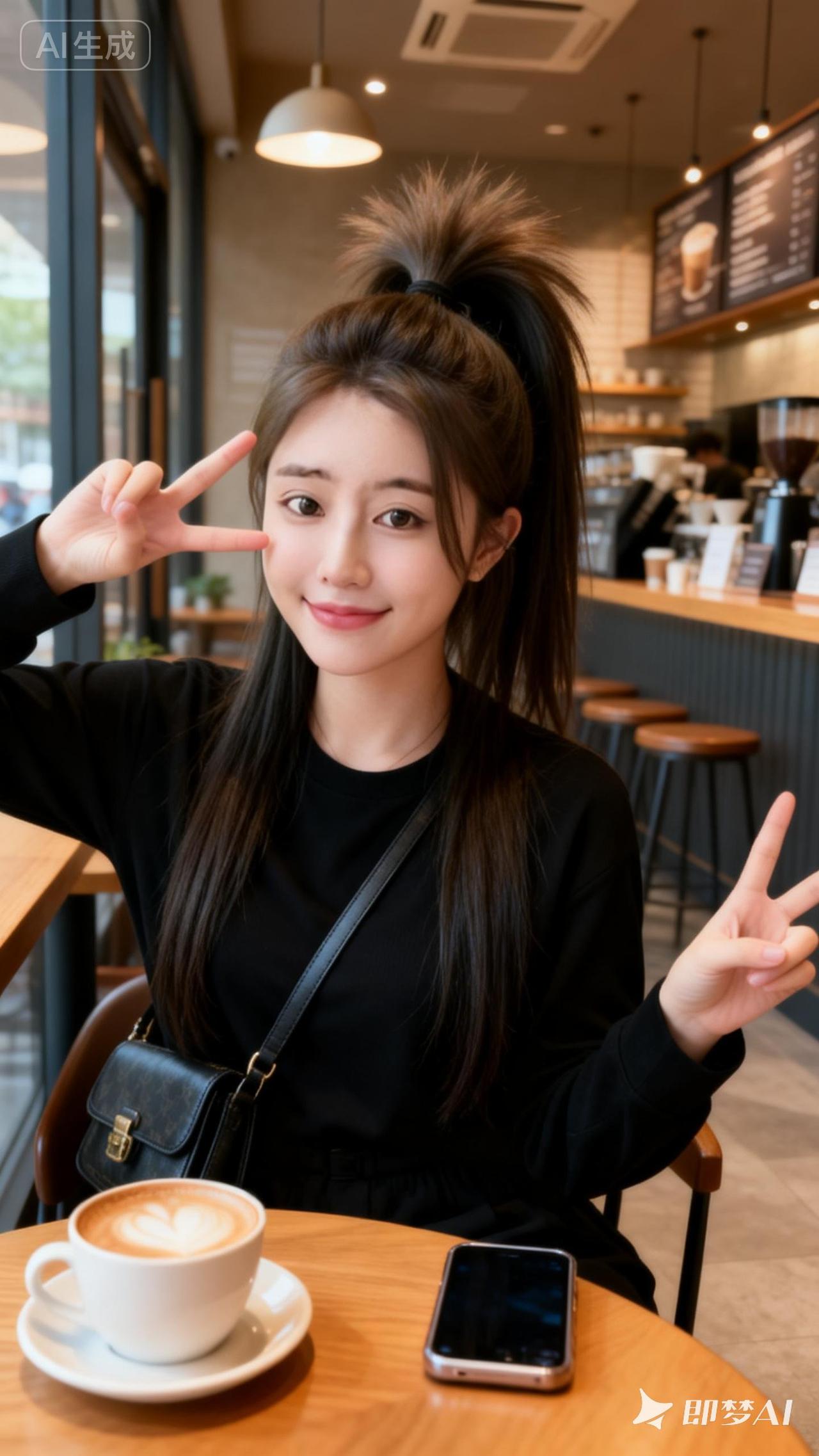 在咖啡店里俏皮可爱的女孩穿着黑色衣服、挎包,桌子上放有杯子和手机,做着可爱的表情动作