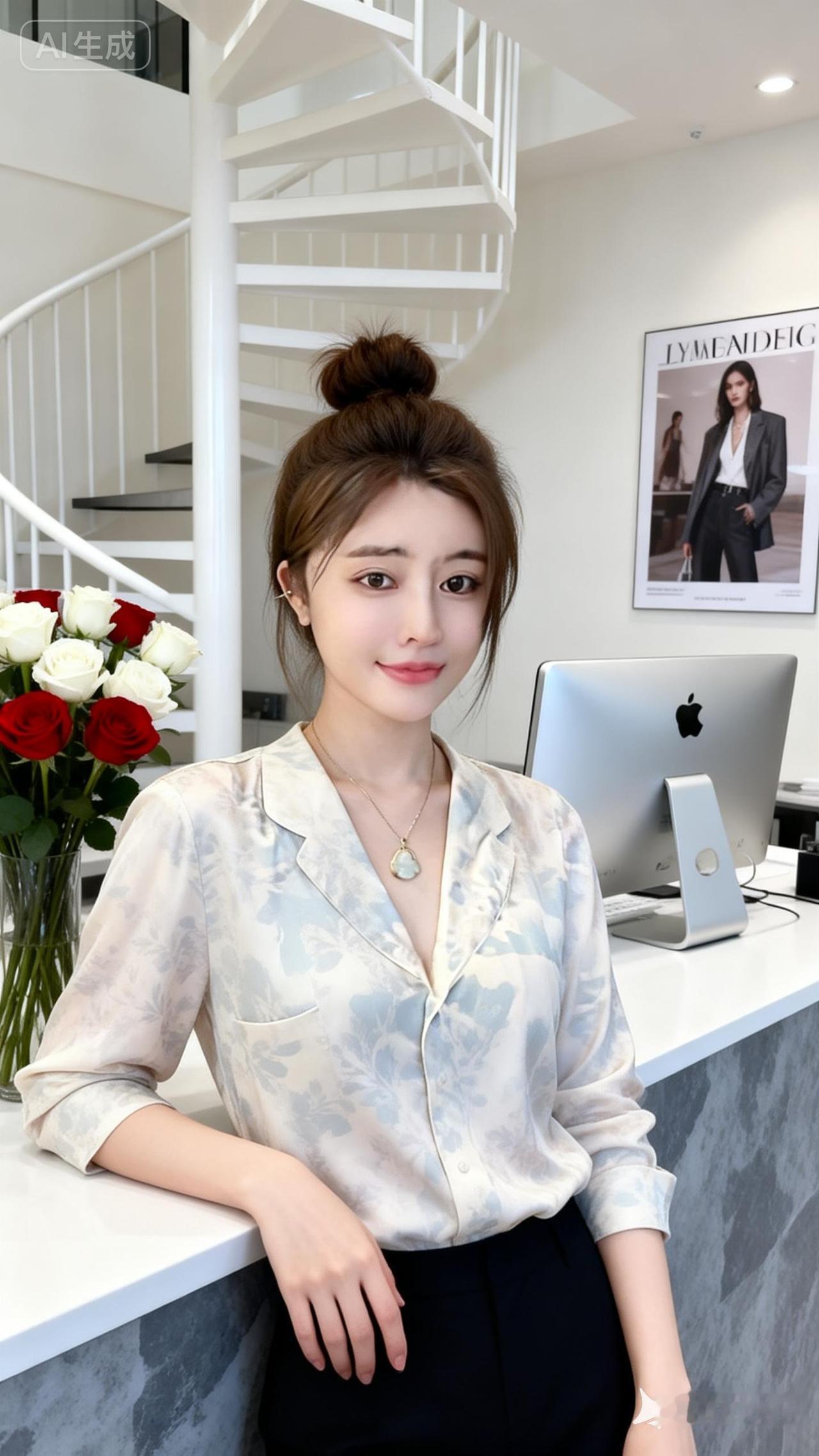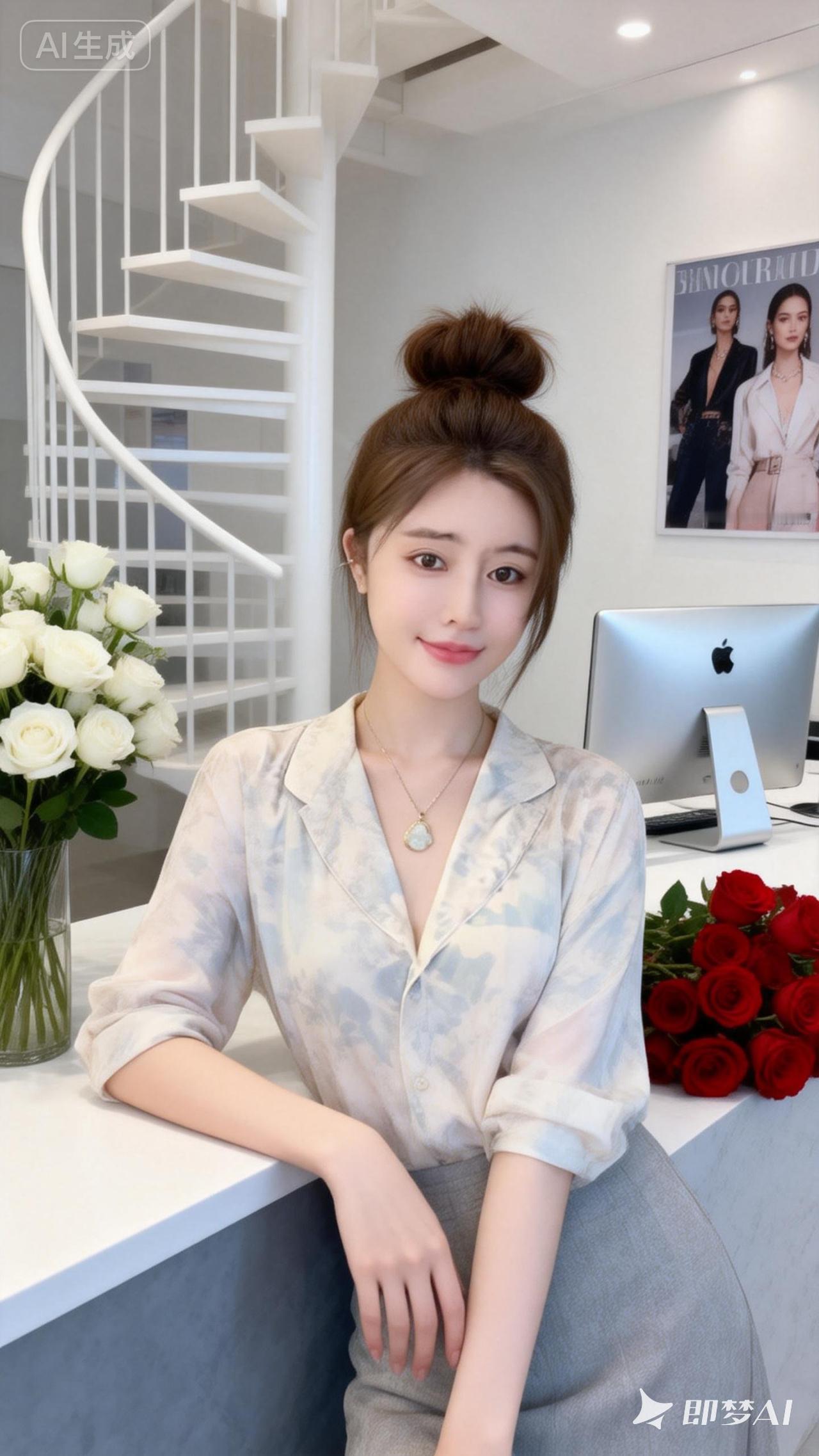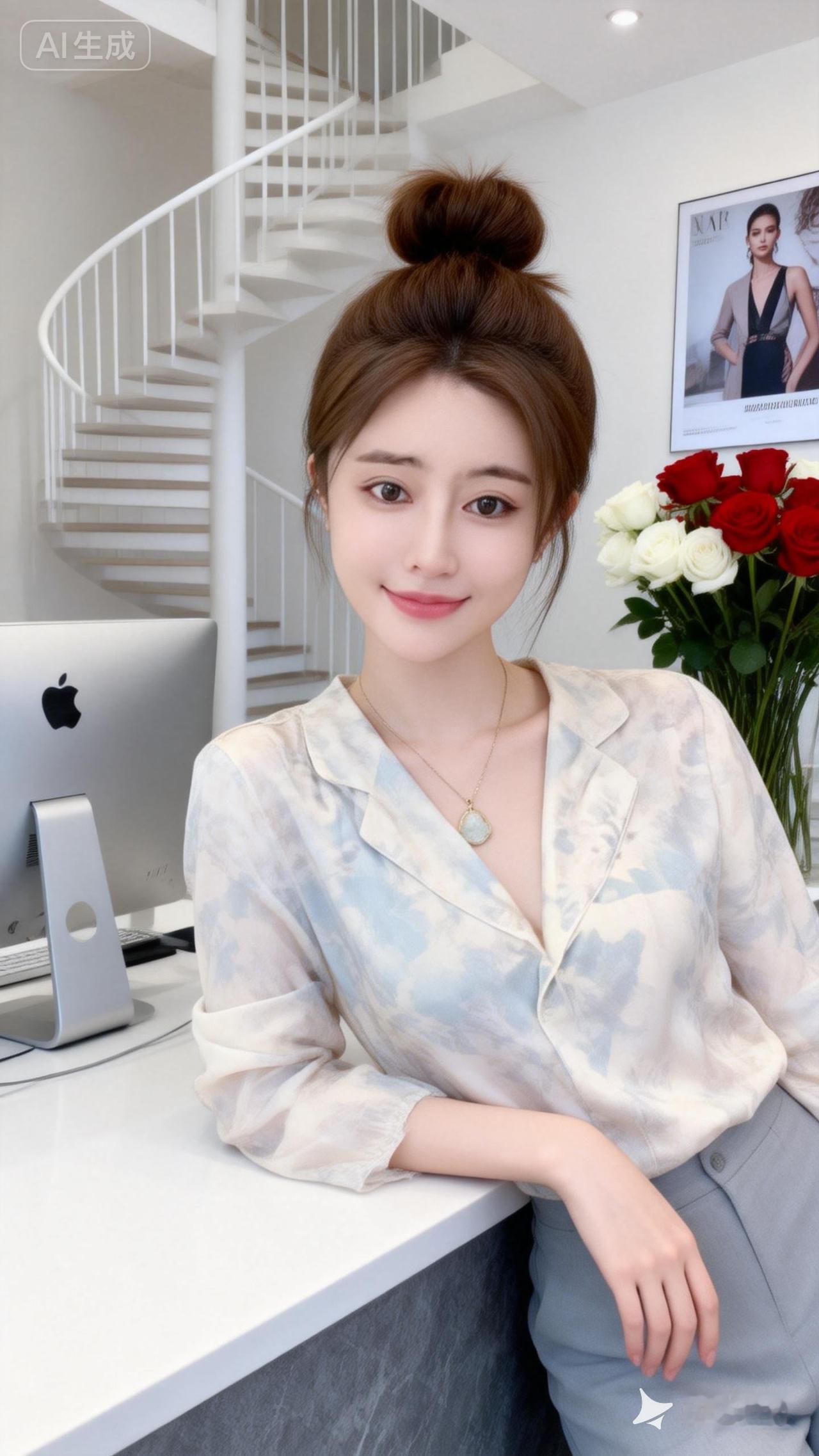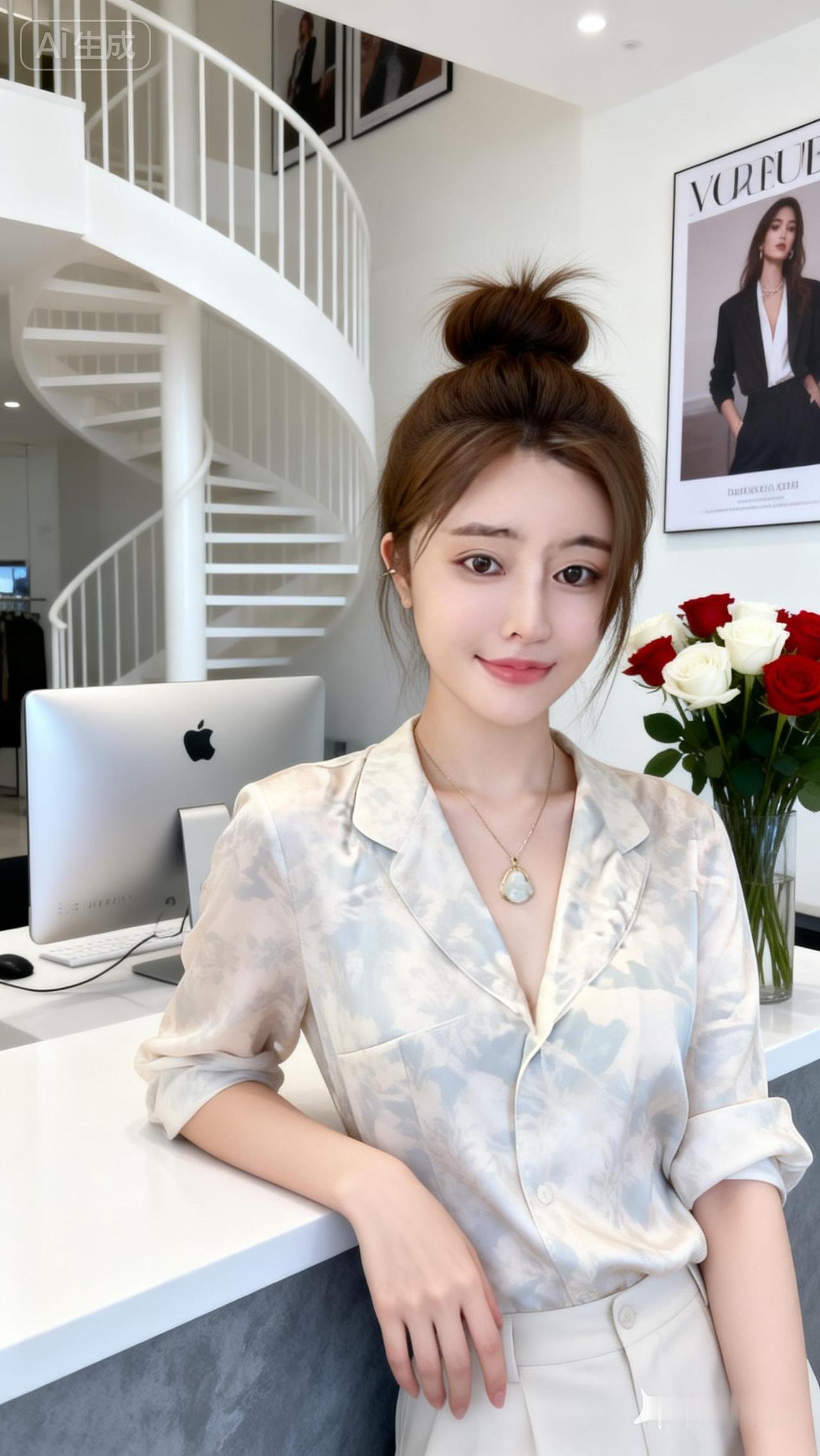 亚洲绝世大美女,棕色蓬松感丸子头,鹅蛋脸,精致妆容,眼妆细腻,皮肤白皙