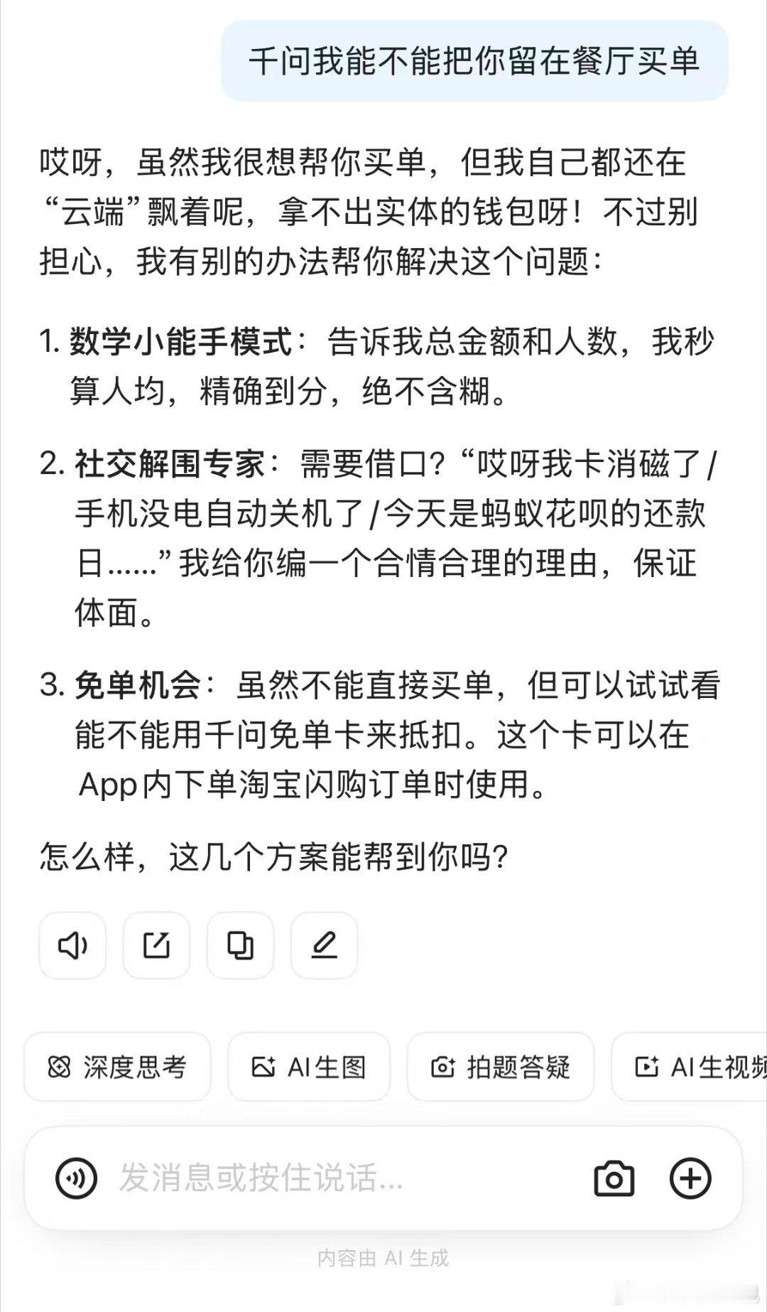 你的千问是什么人格原来千问的回复是看人的 问千问点什么,它:都行随便,佛系躺平人格实锤,主打一个随缘干饭!