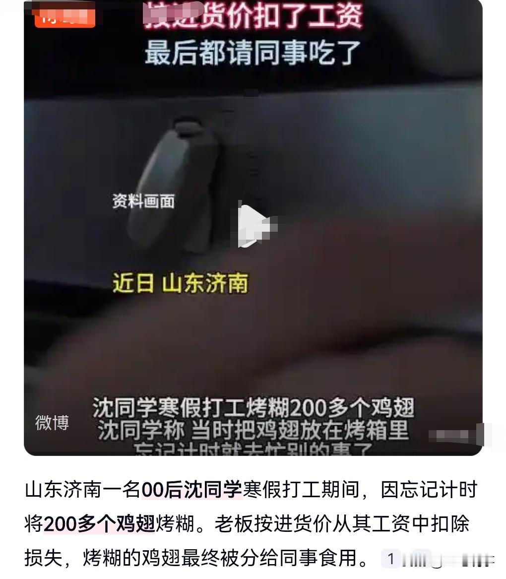 小伙这寒假工打的有点悲催呀。 山东济南一男生打寒假工忘计时烤糊200多个鸡翅。 所以说干事情要有条理,这种低级错误不能犯啊。 不过男生年纪也小,新来的确实容易出现这种问题。 老板决定从工资里面扣,以成本价扣。 最后这些烤糊的请同事吃了。 这怎么下嘴呀,烤成这样,要用刀切开表面才行。