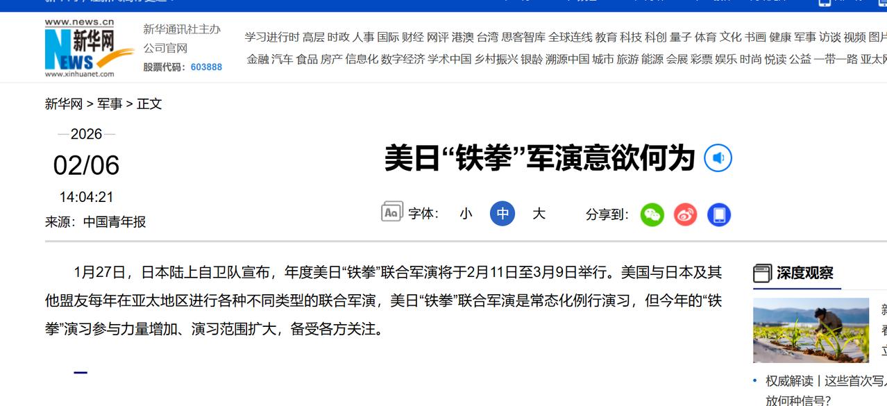 警报拉响!美日联合演习将扩大,解放军突然转向,释放不寻常信号! 大家好,今天咱们聊一个关乎亚太局势的关键消息,没有晦涩的术语,全是实实在在的干货,看完你就明白,当下的地区局势,正在发生不寻常的变化。 就在马年春节临近、大家期盼团圆的时候,美日两国突然官宣,要扩大联合军事演习的规模,这场代号“铁拳”的演习,堪称历年之最,挑衅意味拉满。 可能有人对“铁拳”演习不熟悉,简单跟大家说下,这场演习从2006年就开始了,前十几年一直在美国的军事基地举行,核心就是练“夺岛”本事。但从2023年开始,演习地点直接搬到了日本,而且一年比一年规模大,今年已经是第四次在日本举行,也是有史以来最夸张的一次。 根据新华网、环球时报等权威媒体披露,这场演习定在2月11日到3月9日,刚好横跨咱们的春节假期,这其中的刻意,不用多说大家也能体会到。参演的兵力更是吓人,美军出动了2900人,包括800名海军陆战队员和2100名海军水兵,日军也派出了2000多人,主要是专门负责离岛作战的“水陆机动团”和海上自卫队,加起来快5000人,比往年多了一大截。 除了人多,装备也都是硬家伙。美军要派3艘大型登陆舰,日军则出动驱逐舰、运输舰,还有V-22“鱼鹰”倾转旋翼机、武装直升机这些先进装备,甚至连日本刚组建没多久的“水陆机动团”第三联队,这次也首次成建制亮相,可见日本想提升离岛作战能力的野心有多明显。 更值得警惕的是演习范围,今年直接覆盖了19个地点,主要集中在日本西南诸岛和冲绳地区,而这里离我国很近,更是我国海军进出西太平洋的关键通道。演习还分两个阶段,前期练联合指挥、实弹射击,后期直接加入舰艇部队,练空中突击、海岸封锁,说白了,就是冲着实战去的,针对性不言而喻。 面对美日这种步步紧逼的动作,很多人都在关注,解放军会怎么应对?以往咱们可能更多是在近海开展演练,但这次,解放军突然转向,走出了不一样的路子,释放的信号,既明确又有力量。 不同于以往的被动应对,这次解放军主动调整部署,多战区联动出击,形成了全方位的威慑。东部战区直接派出驱逐舰编队,前出宫古海峡,深入西太平洋开展高强度演练,反舰导弹实射、电子对抗,每一项科目都直指美日军演的关键环节,而且编队离美日演训区域最近的时候,还不到230海里,相当于直接在对方“家门口”展现实力。 与此同时,渤海、黄海北部也同步启动了军事任务,海军舰艇练反潜、练夜间补给,牢牢守住北方的海上战略咽喉;南海方向,南部战区刚完成海空联合巡航,海警和军方联动,形成了严密的管控体系。从西太平洋到南海、黄渤海,解放军的行动南北呼应,打破了以往单一方向应对的局限,展现出的联合作战能力,不容小觑。 可能有人会问,解放军这次的转向,到底释放了什么信号?其实很简单,第一,我们不再局限于近海防御,已经具备了远海护卫的能力,能够在第一岛链外建立防御屏障,不让外部势力随便介入周边事务。第二,多战区联动,说明我们的指挥体系越来越高效,能够随时应对任何方向的安全挑战。第三,也是最关键的一点,我们的演练全程都是在国际法允许的范围内进行,既展现了决心,又保持了克制,和美日刻意制造紧张局势的行为,形成了鲜明的对比。 说到底,美日扩大联合演习,本质上就是想搞阵营对抗,通过强化军事联动,构建针对中国的封锁圈,试图遏制我们的发展。但他们忘了,现在的中国,早已不是以前的样子,解放军有决心、有能力,捍卫国家的主权和海洋权益,守护亚太地区的和平稳定。 和平发展才是当下的主流,美日这种借军演秀肌肉、搞挑衅的行为,不仅会加剧地区紧张,还会遭到国际社会的反对。而解放军这次的突然转向,就是给美日划下红线:任何试图破坏地区稳定、触碰中国核心利益的行为,都将遭到坚决反制,一切徒劳的挑衅,最终只会搬起石头砸自己的脚。
