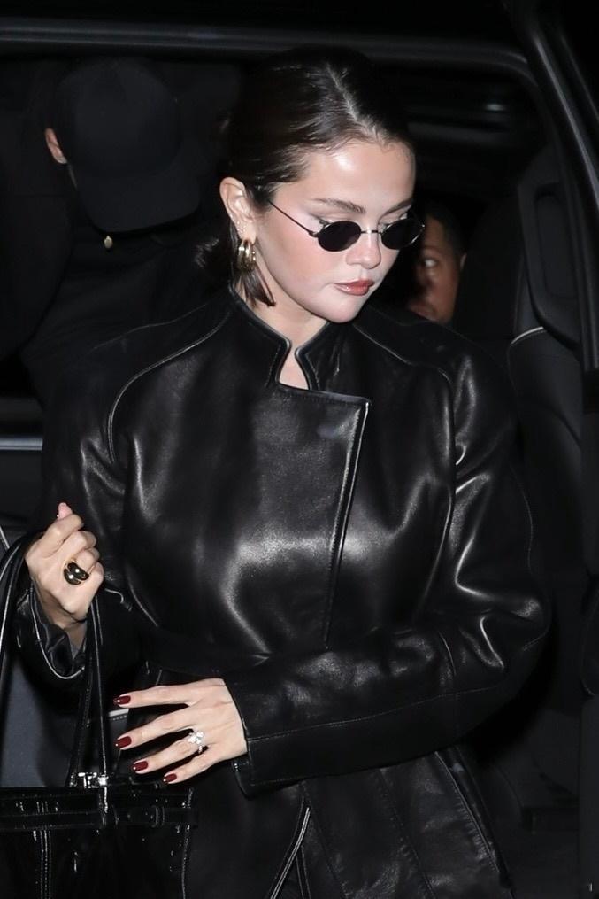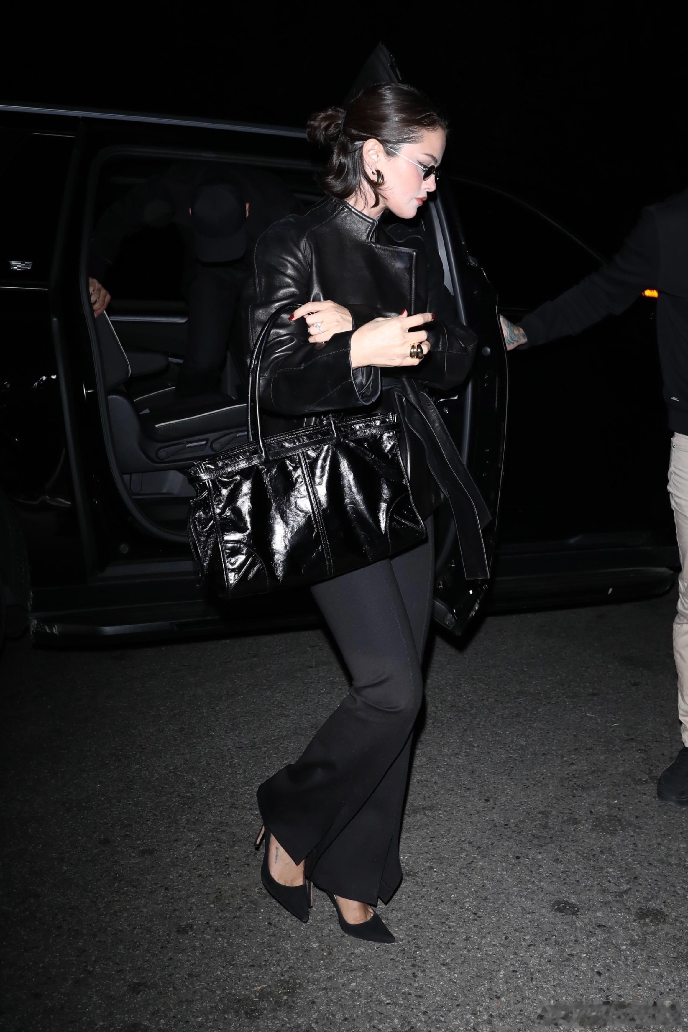 Selena Gomez赛琳娜戈麦斯在西好莱坞外出,身着一套黑色皮衣搭配同色长裤和皮包离开Brooks Nader的生日派对