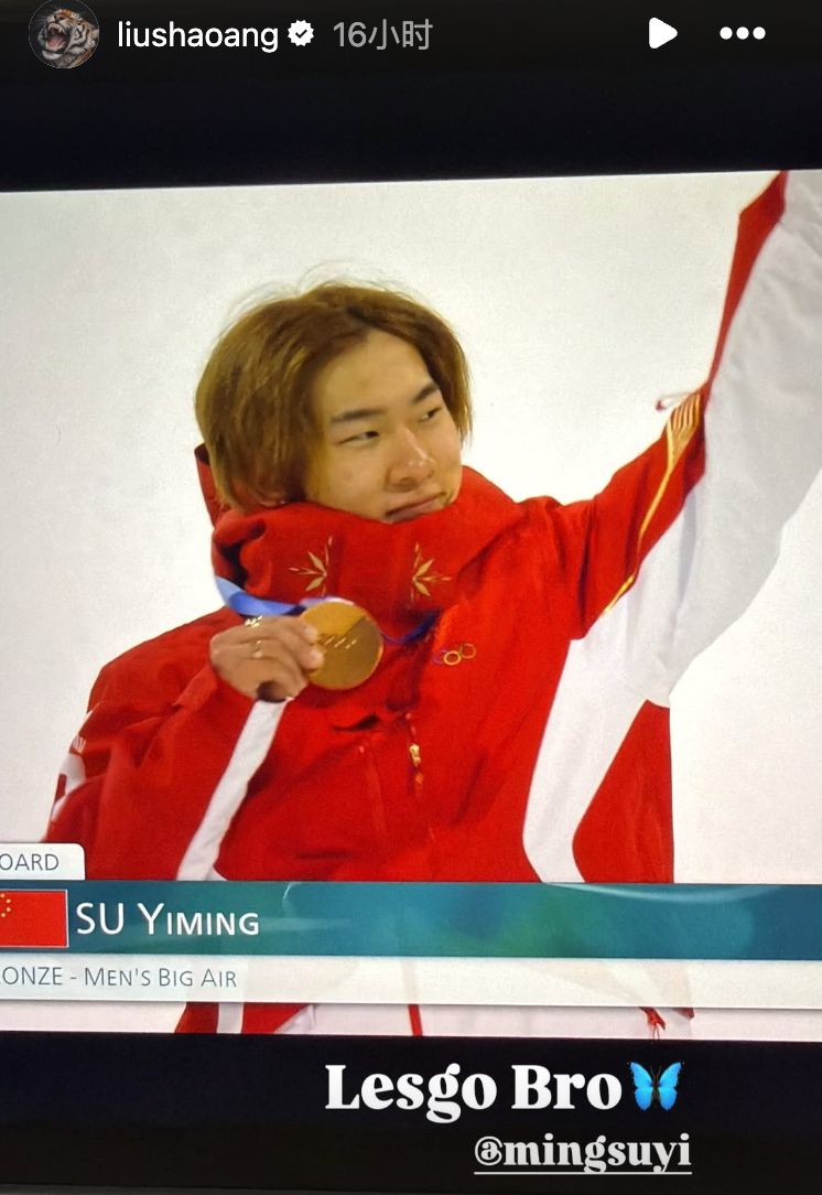 刘少昂在社交平台发图恭喜苏翊鸣单板滑雪男子大跳台摘铜,一句Lesgo Bro尽显兄弟情谊,奥运健儿之间的互相致敬,真的又燃又暖!