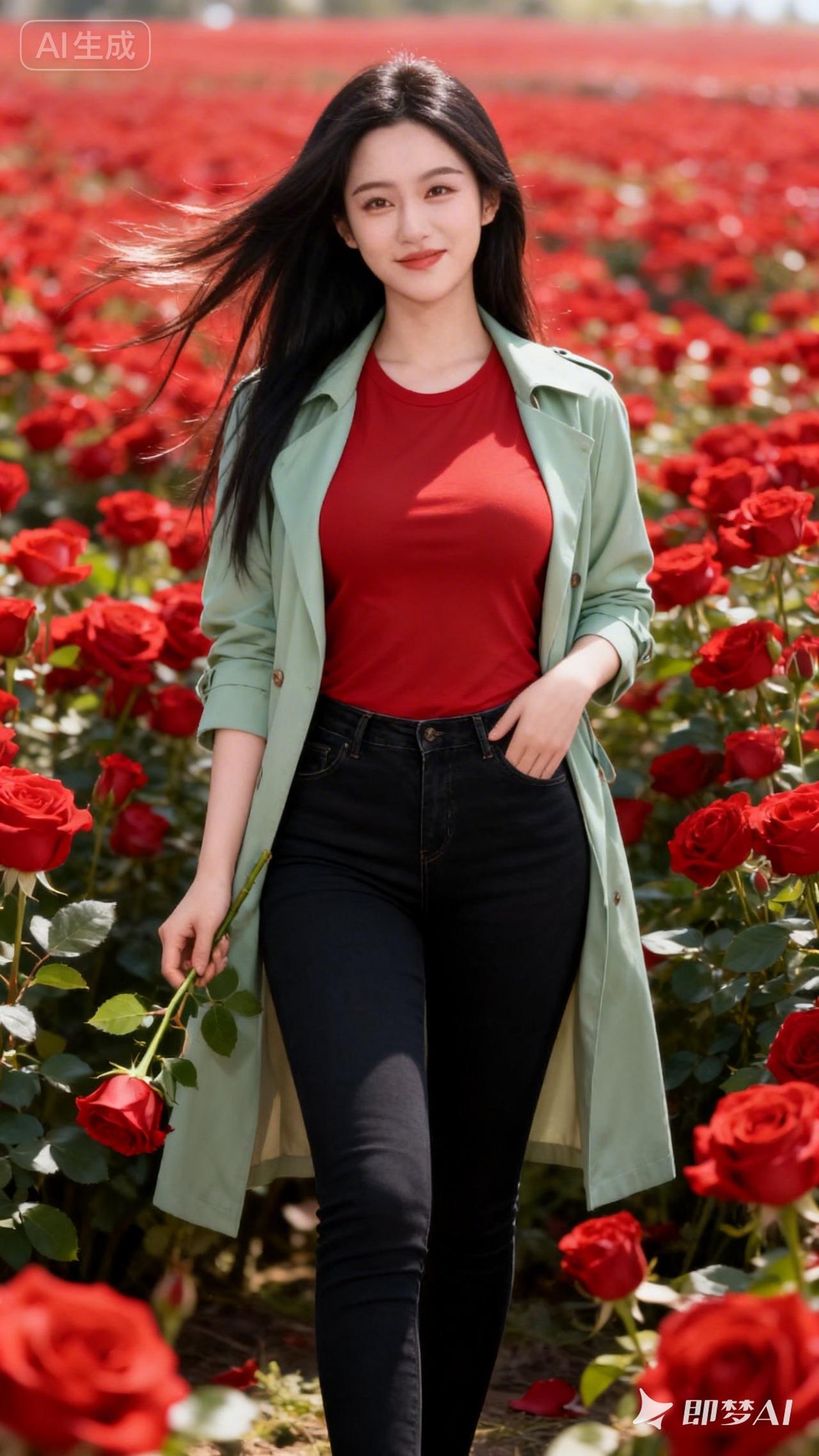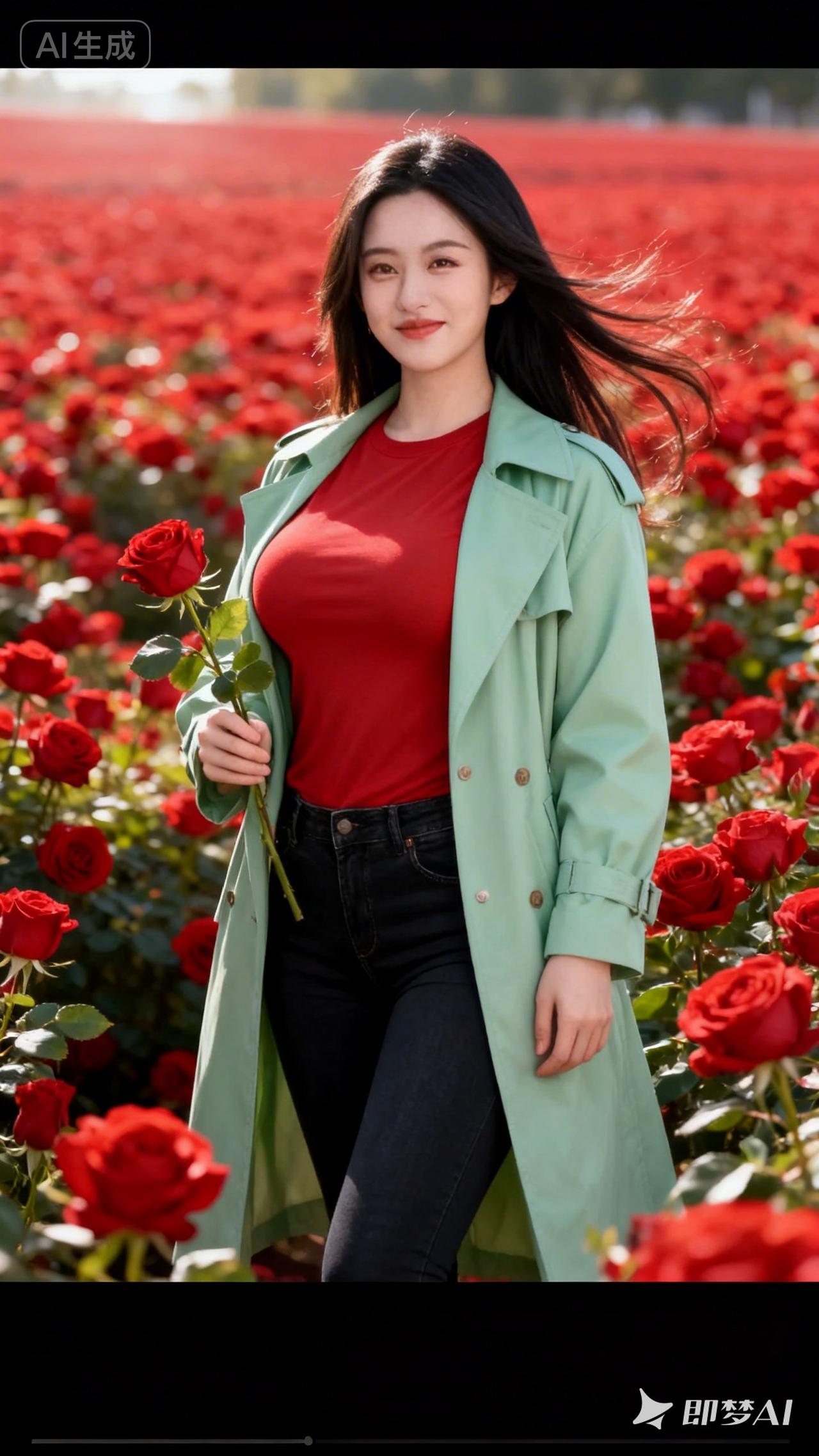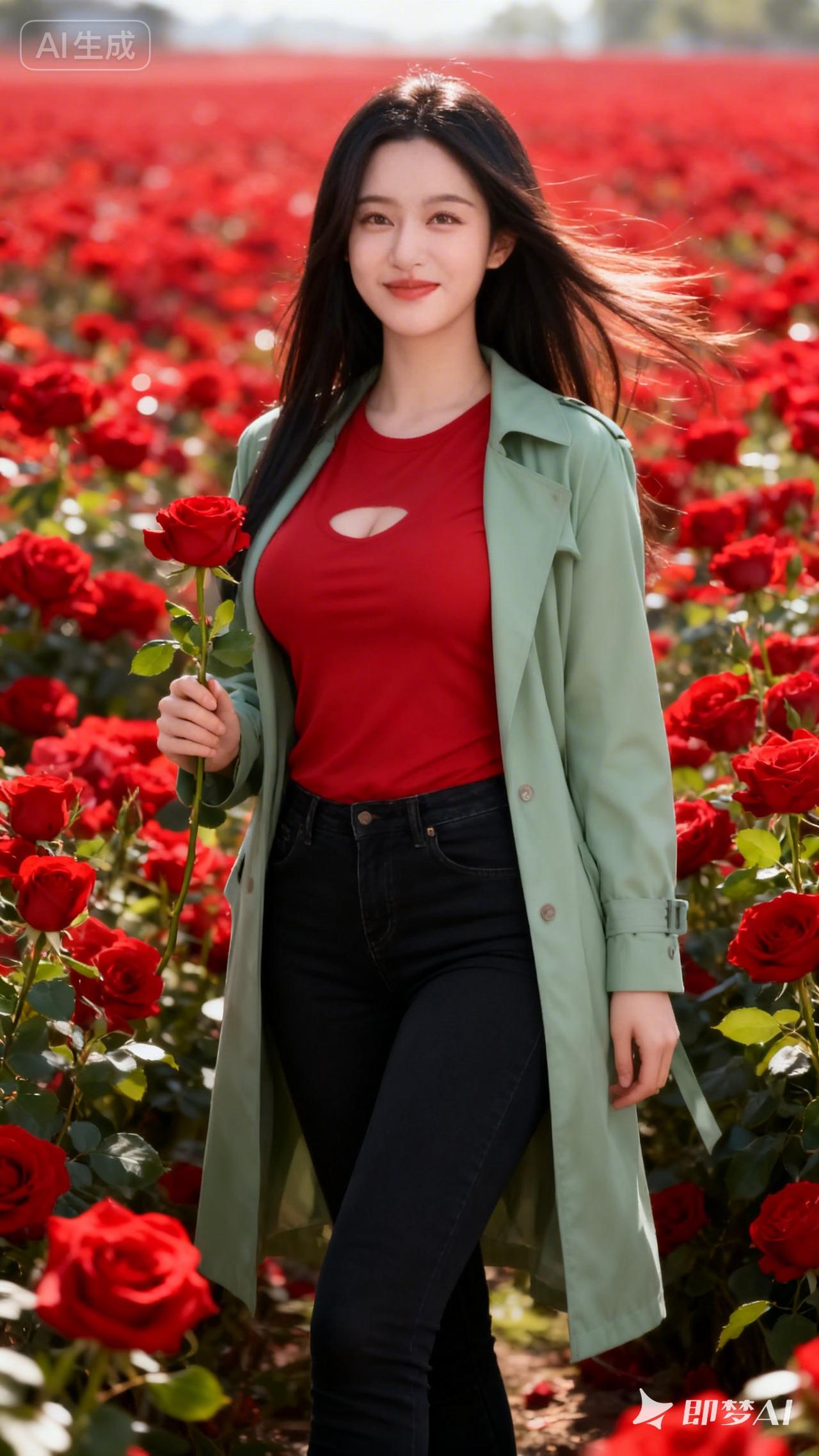 在花海中漫步,手捧一朵红玫瑰,感受自然的美好与浪漫。