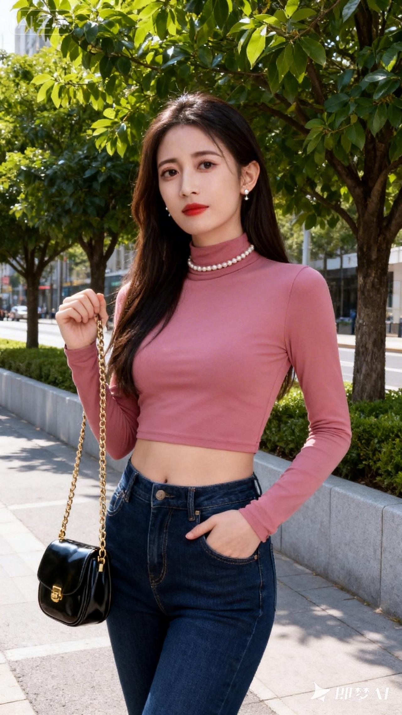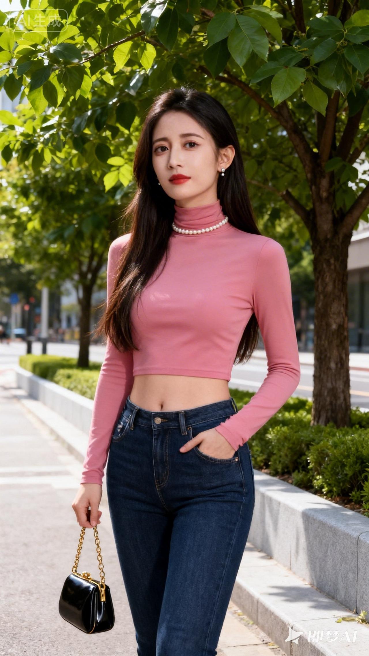 粉色高领毛衣搭配牛仔裤,优雅气质满满!