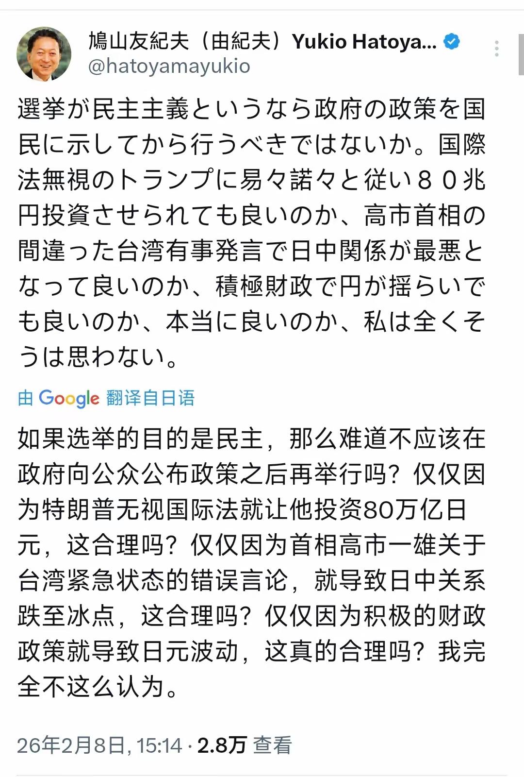 日本前首相鸠山由纪夫今天(2月8日)写道:“如果选举真的是民主的体现,难道不应该在向国民明确政府政策之后再进行吗?我们真的可以默许政府在无视国际法的特朗普面前唯命是从,白白投入80万亿日元吗?真的能接受高市首相在台湾问题上的错误言论,让日中关系恶化到谷底吗?真的可以任由积极财政政策导致日元汇率动荡不安吗?真的可以吗?我绝不这么认为。” 首先需确定一点:鸠山由纪夫说的对与不对,都是处于对日本利益的考虑而非其他。但是在日本,应该做什么与是否正确不存在必然联系,取决于在当时当下在日本说了算的人,以及由他组成的集团主流,在这个集团主流面前,民主不存在,而民意虽存在,但都以追随主流为荣耀,从众是日本人的自动选择,无关对错。二战时与美国开战如此,现在——不管对错——追随高市早苗就是如此,将来去追随新的集团主流将继续如此。 而当下的今天(2月8日),立法选举已经结束,高市早苗再次当选日本首相已成定局,这就是日本人追随、从众的具体体现,根本不需要鸠山由纪夫说的需要向他们“明确政府政策”,无论她干什么,都会支持! 而事实上,鸠山由纪夫说的所有话所表达的并不是担心高市早苗继续出任日本首相,而是担心高市早苗再次出任日本首相后,带领日本去挑战不该至少现在他认为不该挑战的国家,给日本带来痛不欲生的国家灾难。对于对日本的“爱护”,鸠山由纪夫,他并不输于高市早苗!