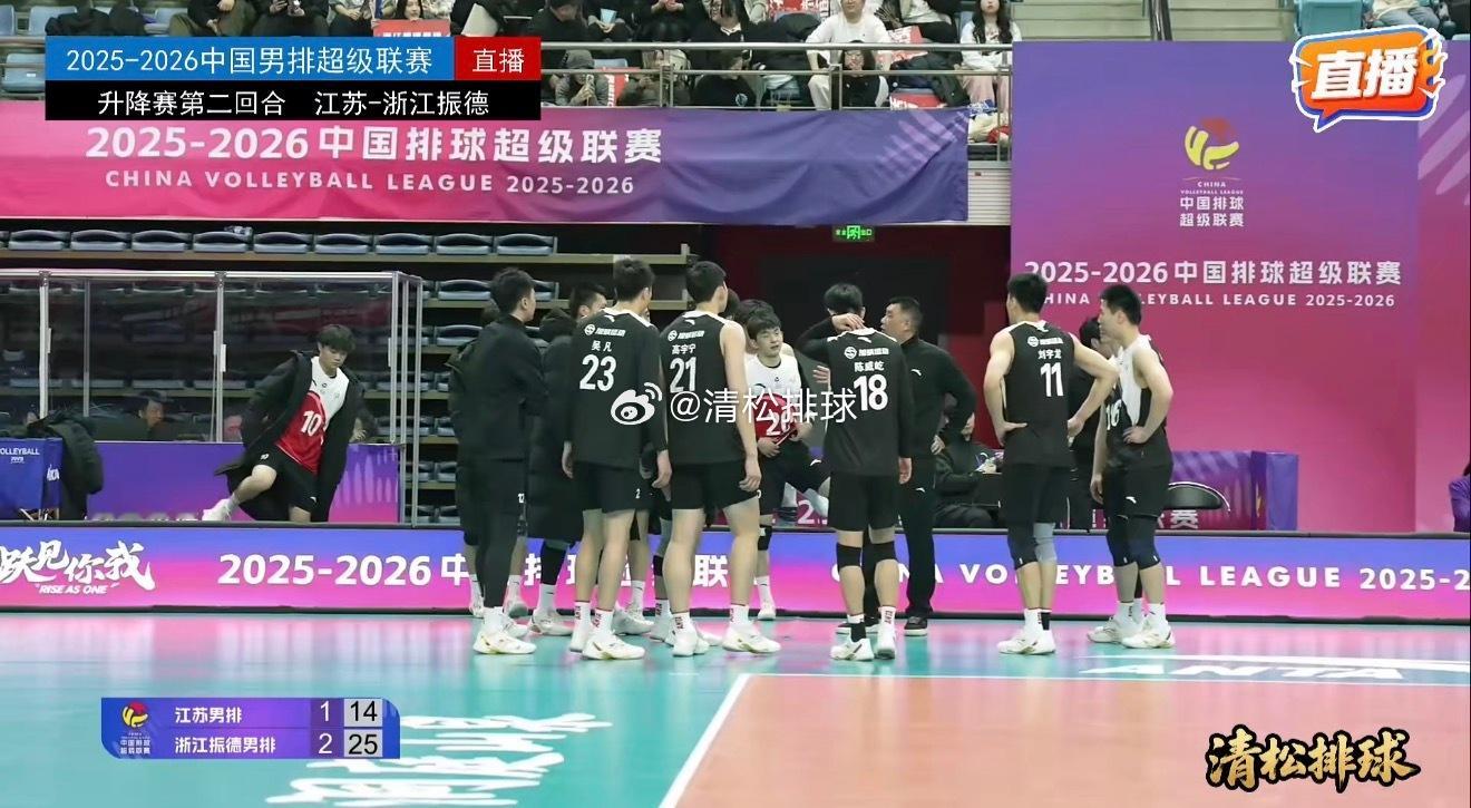 【升降赛次回合 浙江男排逆转江苏将战决胜金局】2025-2026中国男排超级联赛赛中升降赛第二回合,浙江振德男排客场3-1(25-27 25-23 25-21 25-14)战胜江苏男排,双方总比分1-1平,即将进行决胜金局,获胜者晋级A级季后赛。