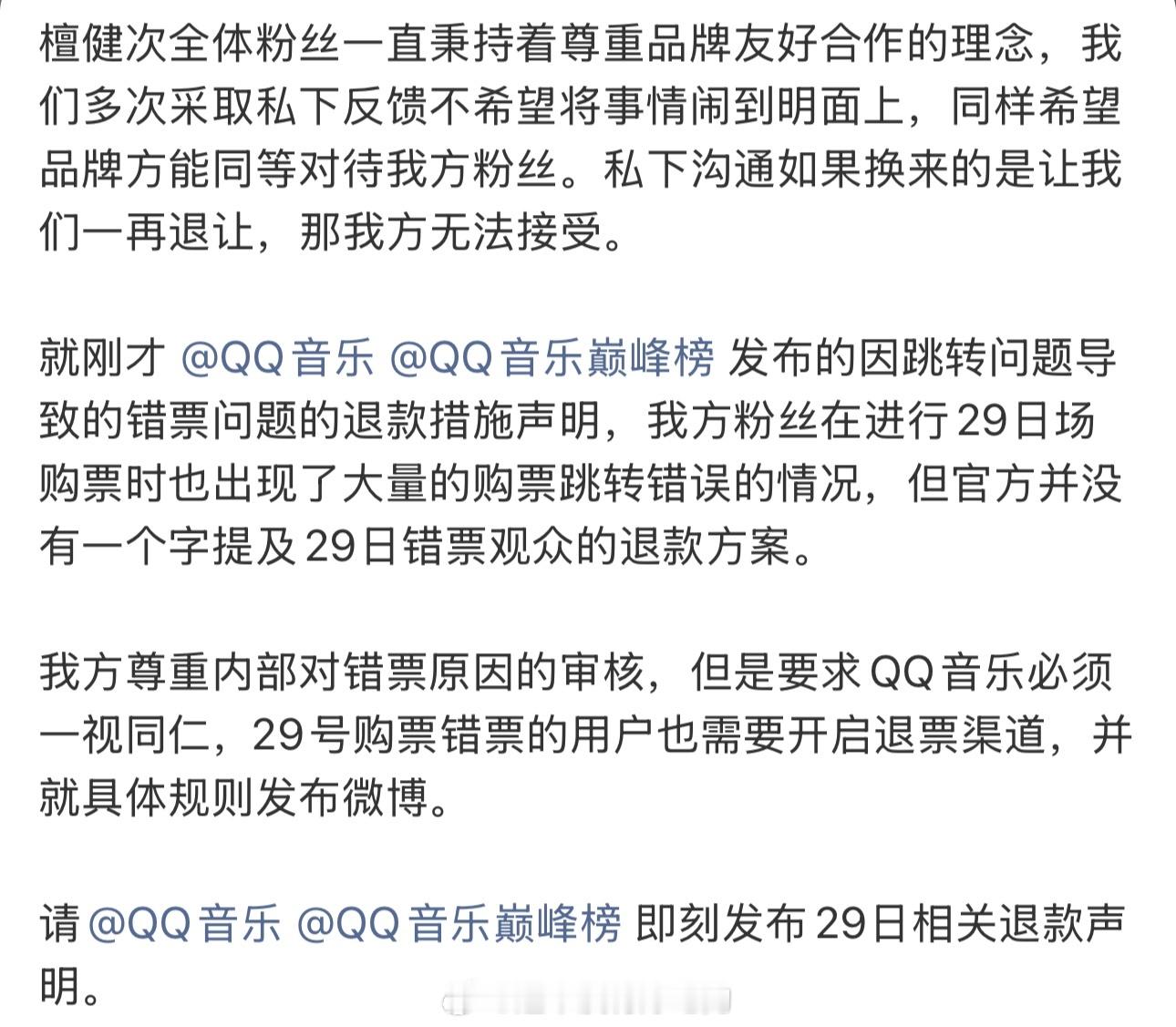 檀健次粉丝维权,请Q音一视同仁,即刻发布29日相关退款声明