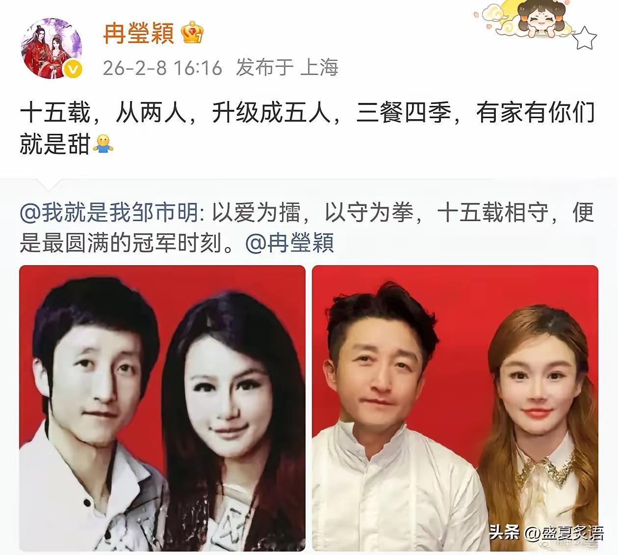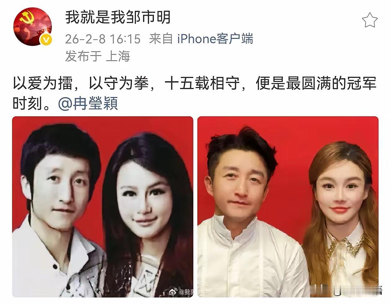 邹市明夫妻,同时发文! 2月8日16:15,邹市明和冉莹颖,突然在社交平台同时发文,前后时差不超过一分钟,原来俩人同步晒出结婚15周年纪念动态,让人觉得十分不容易。 邹市明火了以后,他老婆满脸都是“终于到我抛头露面”啦。 冉莹颖没有错啊,她很优秀,利用自己的资源给丈夫拉资源,组酒局,陪喝酒。对丈夫不离不弃,谁不想过更好的生活,创业失败不是她的错。 网友表示:心太大了,守住那1亿就可以用几辈子了。🤦 2 亿,邹市明曾亲口承认投入远不止 2 个亿,现金投入 2 亿,负债还款光卖掉上海黄浦江边的豪宅就 8000 万,还有美国和北京的豪宅也都出售了。保守在 3-3.5 亿亏损。 谁还记得,邹市明曾是站在世界之巅的中国拳王。 两届奥运金牌加身,三夺世界拳王金腰带,风光无限。 可如今,他创业7年赔光2亿家产,负债累累。 更让人唏嘘的是,亲手扯下他最后一块“遮羞布”的。不是别人,正是陪他走过巅峰、也陪他跌入谷底的妻子冉莹颖…… 从一开始,就觉着这个女人不简单,很能作,邹市明的失败我觉得冉莹颖占一大半责任,看邹的样子,不像是个不务实事,就想创业的样子,反而冉莹颖,一直不甘心平庸,想靠着邹的光环进入上流社会。 就是虚荣心作祟,但凡顾家都不可能乱花钱 ,乱创业,至少留一个亿不动!没什么文化的人,突然暴富了是根本掌控不了钱财的!最终结果就是负债累累! 我感觉他媳妇的确没那经商头脑,之前她老公还在打拳的时候她就很能作秀,那种很明显和刻意的作秀,感觉是一个没有什么大智慧的女人。 他们不懂财务,要我的话,宁愿躺平也不随意投资做生意,两个亿,只生活,足够用到下下辈子了。不过他们的现在也只是暂时的,因为他们有三个孩子,别再让孩子们背债了,孩子们一定会让他们夫妻走出困境的。 我说实话,邹市明面相跟做生意没有关系,甚至这个面相表示他思路还会受限制~而冉这个老婆看着就是非常要强,不折腾点东西不甘心的那种,冉还给自己儿子吃什么增高药还是做了什么增高手术,记不太清,我当时第一反应就是尊重孩子成长吧,这个妈妈太要强了放过孩子的身高吧……不是说展示出来的必须什么都要完美才能体现自己的精明能干或者嫁得好的~实际上也许对男方来说压力巨大……